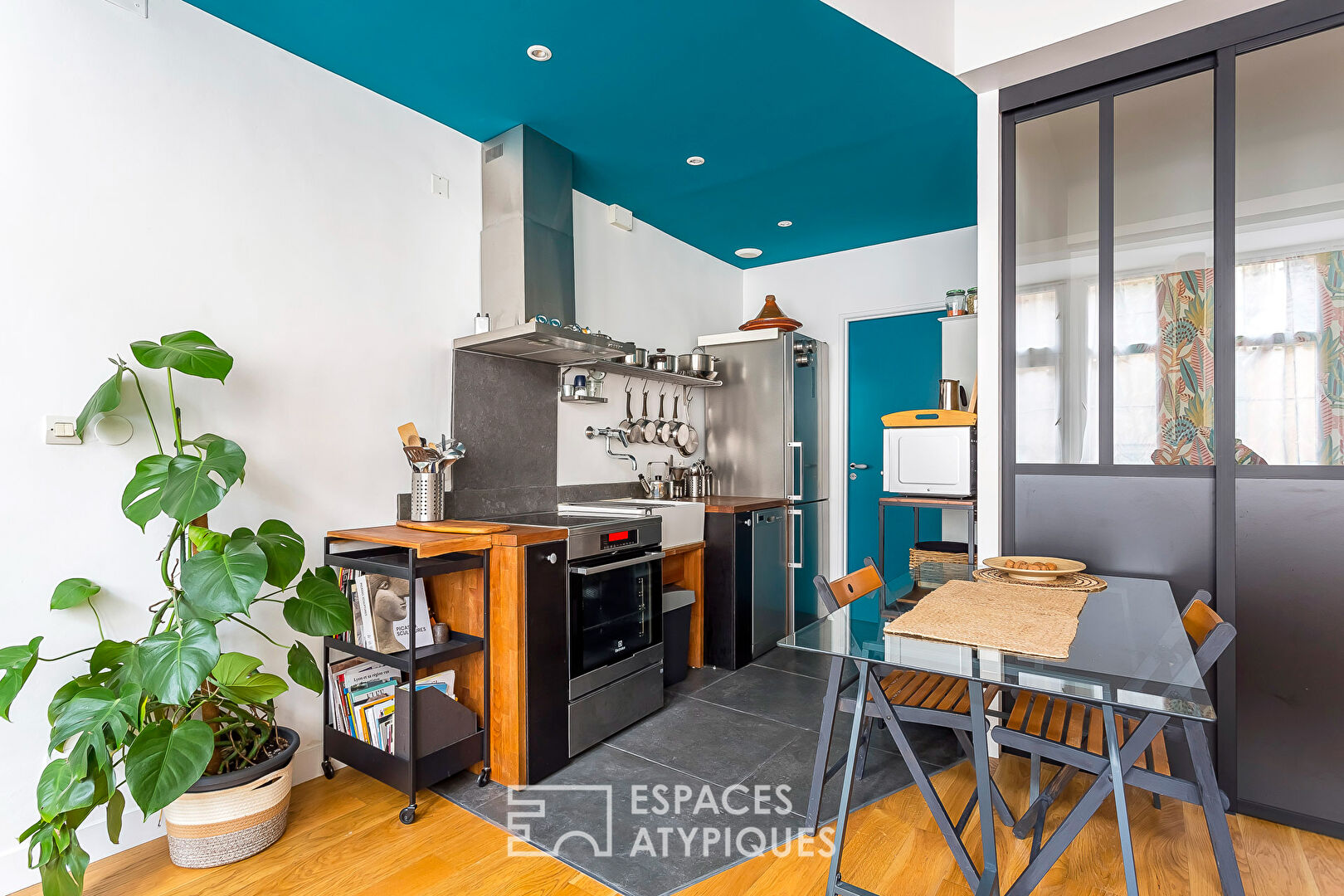 Dès l’entrée, le charme de l’ancien opère et crée une atmosphère chaleureuse. L’espace de vie s’organise autour d’une cuisine ouverte moderne et fonctionnelle. Les deux chambres, en second jour, offrent calme et modularité. L’une d’elles, agrémentée d’une élégante verrière sur mesure, peut servir de prolongement du salon, de bureau ou de chambre fermée selon vos besoins.