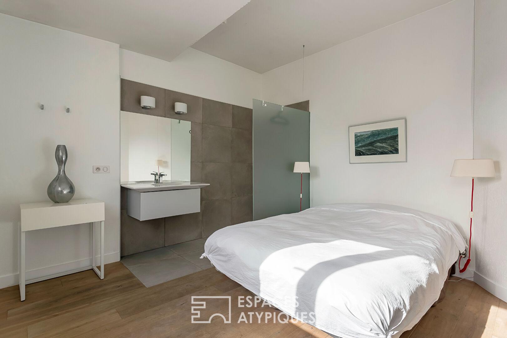 Élément architectural fort, un superbe escalier en colimaçon invite à la verticalité. À l’étage, l’espace nuit a été conçu comme une suite. La chambre, raffinée, intègre une salle d’eau moderne ouverte et de vastes placards. Ici, la vue s’évade au-dessus des toits lyonnais pour embrasser la célèbre Tour Rose, symbole iconique de la Renaissance lyonnaise. Un tableau vivant qui change au gré des lumières de la journée.