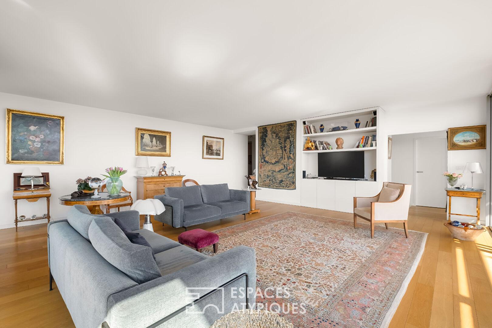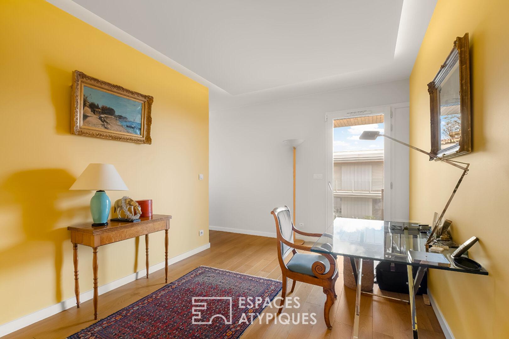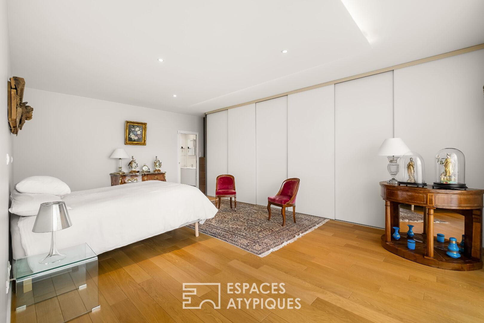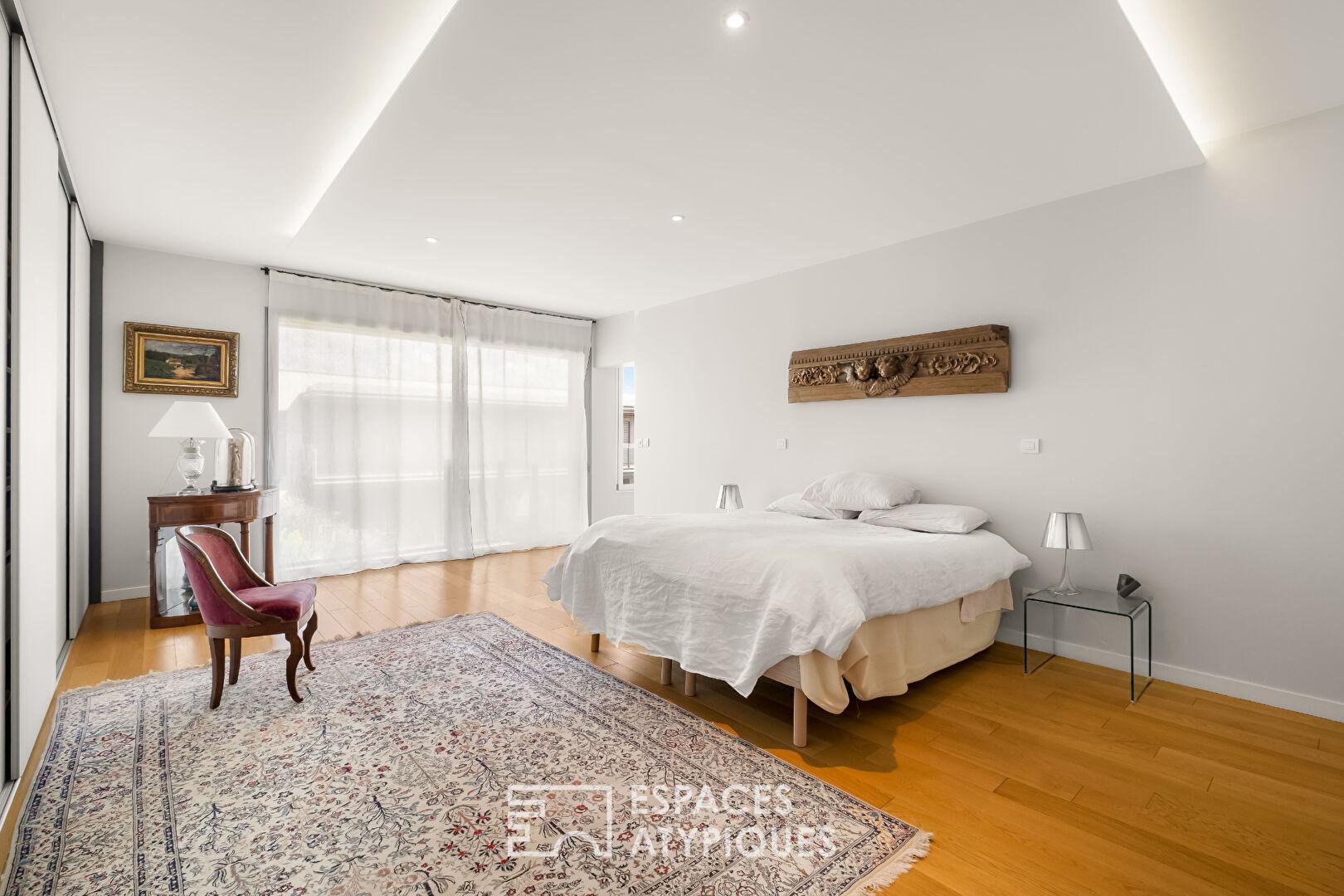 L’entrée s’ouvre sur un vestiaire et distribue des volumes généreux, pensés avec fluidité. Le séjour de 52 m², baigné de lumière grâce à de larges ouvertures, se prolonge naturellement vers la terrasse, créant une continuité dedans-dehors appréciable. La cuisine indépendante, fonctionnelle et élégante, dispose également de son accès extérieur. Une salle à manger vient compléter cet espace de réception.