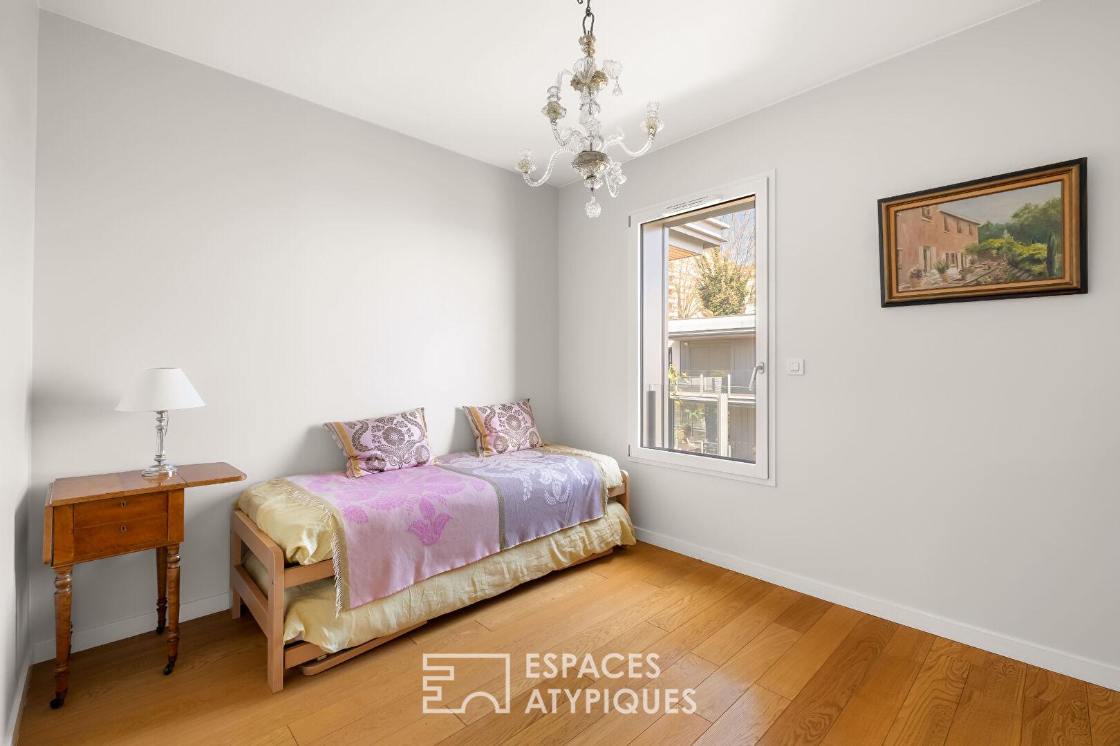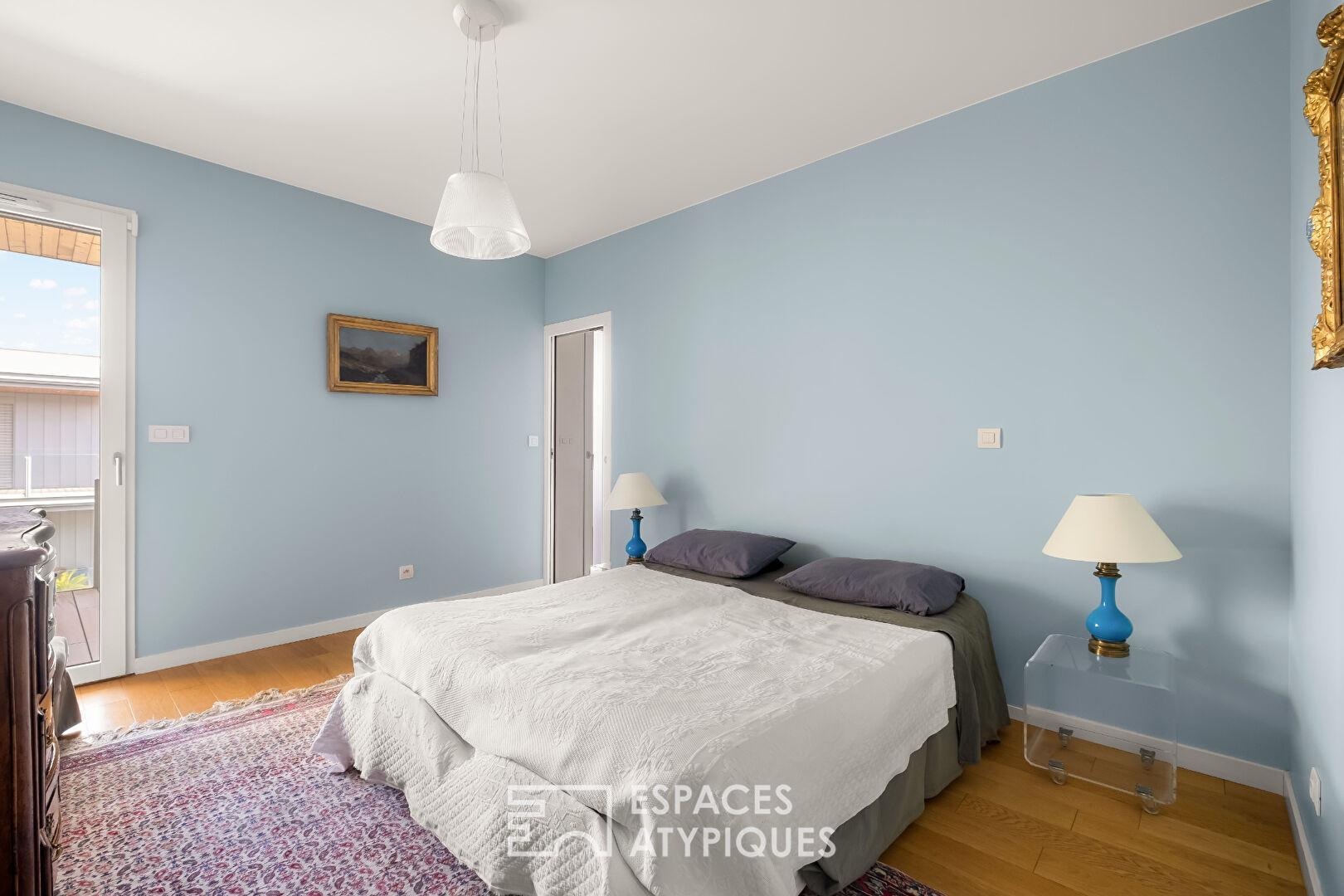 L’espace nuit se compose de trois chambres, dont une suite parentale avec salle d’eau et wc privatifs, ainsi qu’une seconde chambre avec salle d’eau. Une salle de bains indépendante, une buanderie/cellier et deux wc complètent cet agencement. Le parquet en chêne et les lignes contemporaines confèrent à l’ensemble une atmosphère chaleureuse et soignée.