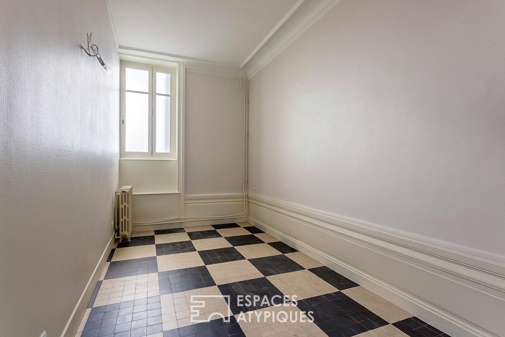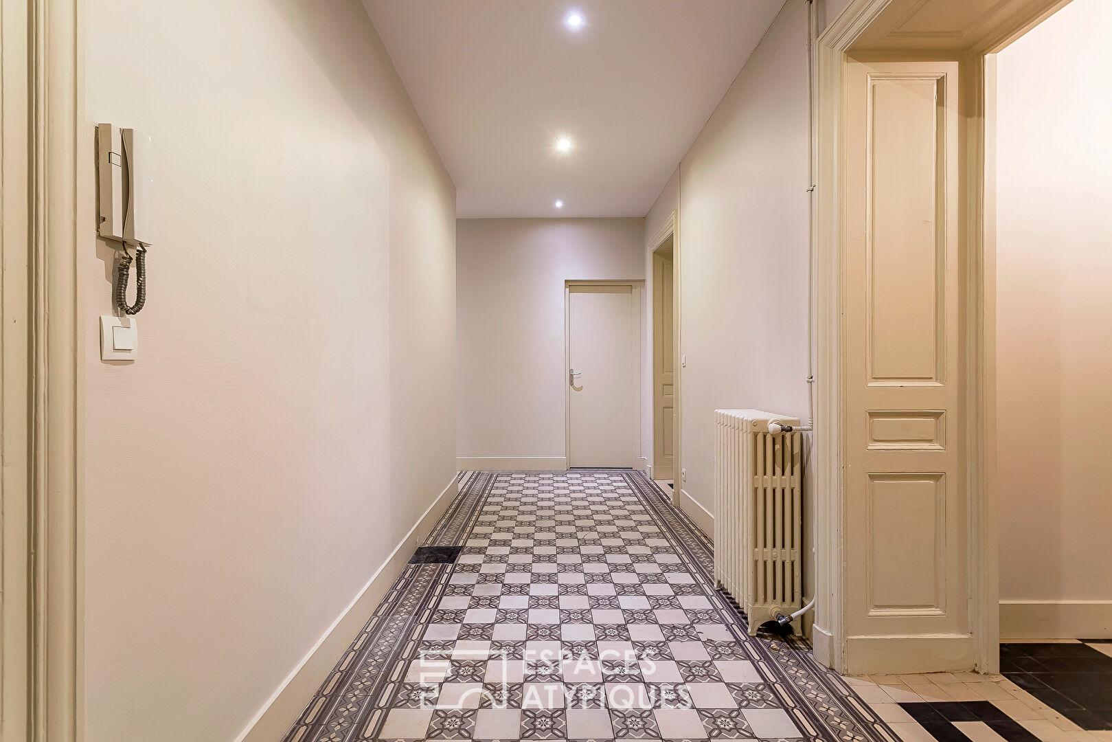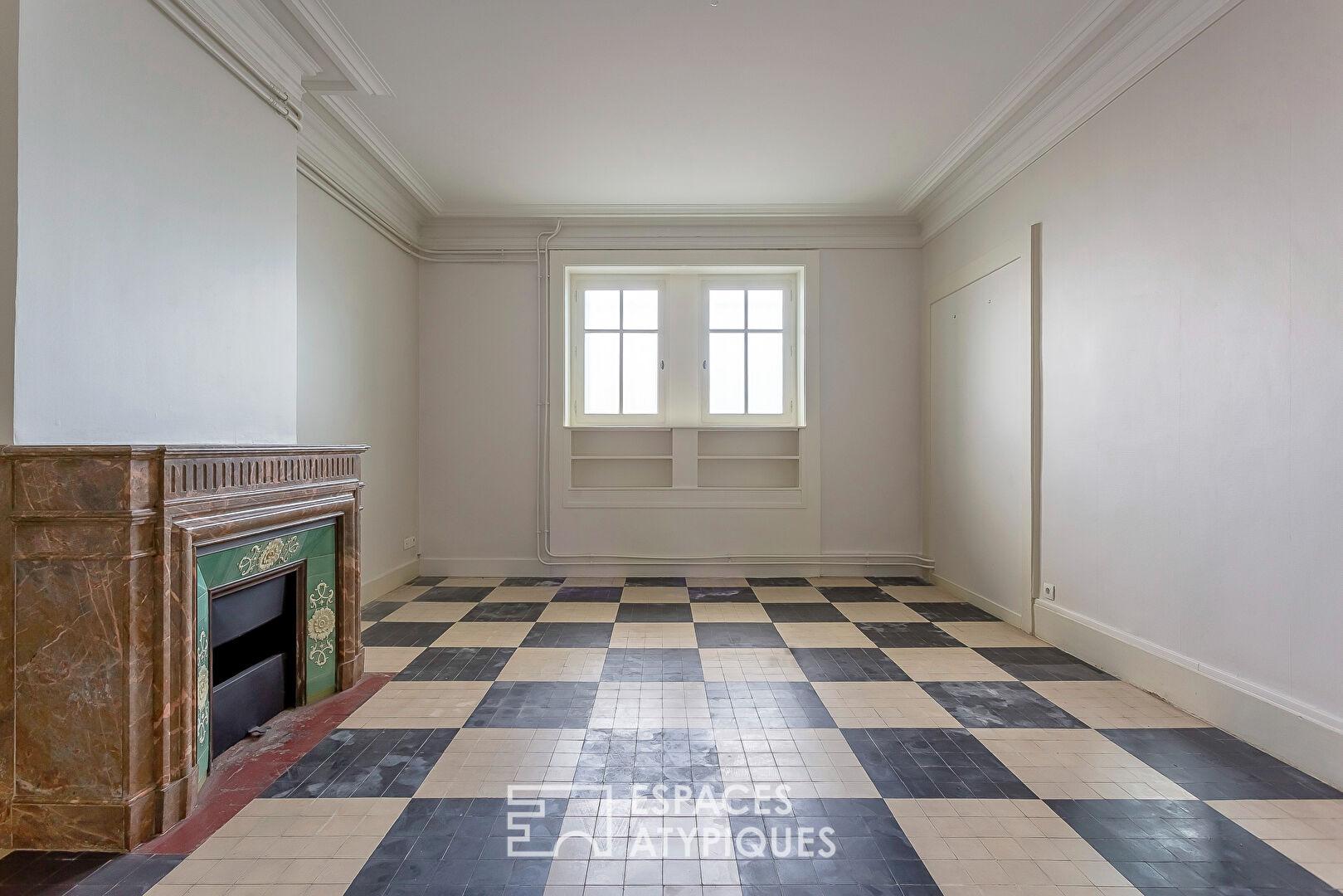 L’entrée se prolonge d’un couloir qui dessert une très grande pièce de vie avec la vue parc. Hauteur sous plafond, moulures, parquet chevron, cheminées d’époque, les codes de l’ancien sont très présents dans ce bien. Une grande cuisine/salle à manger renforce cette pièce de vie XXL.