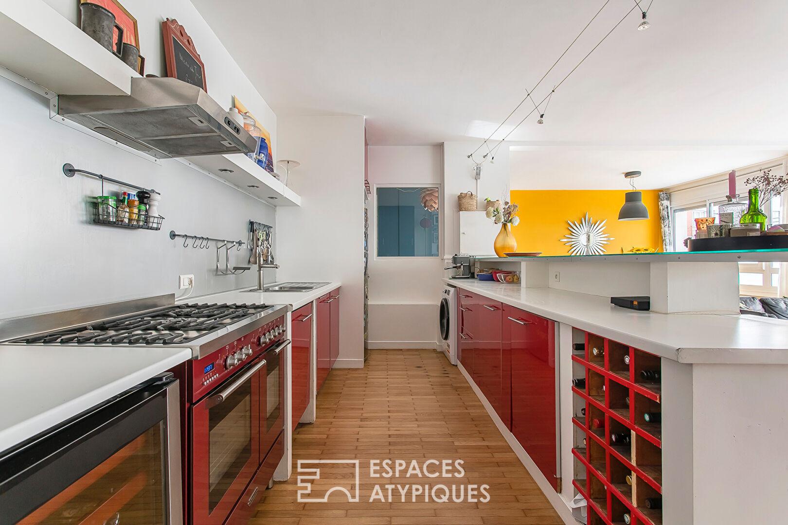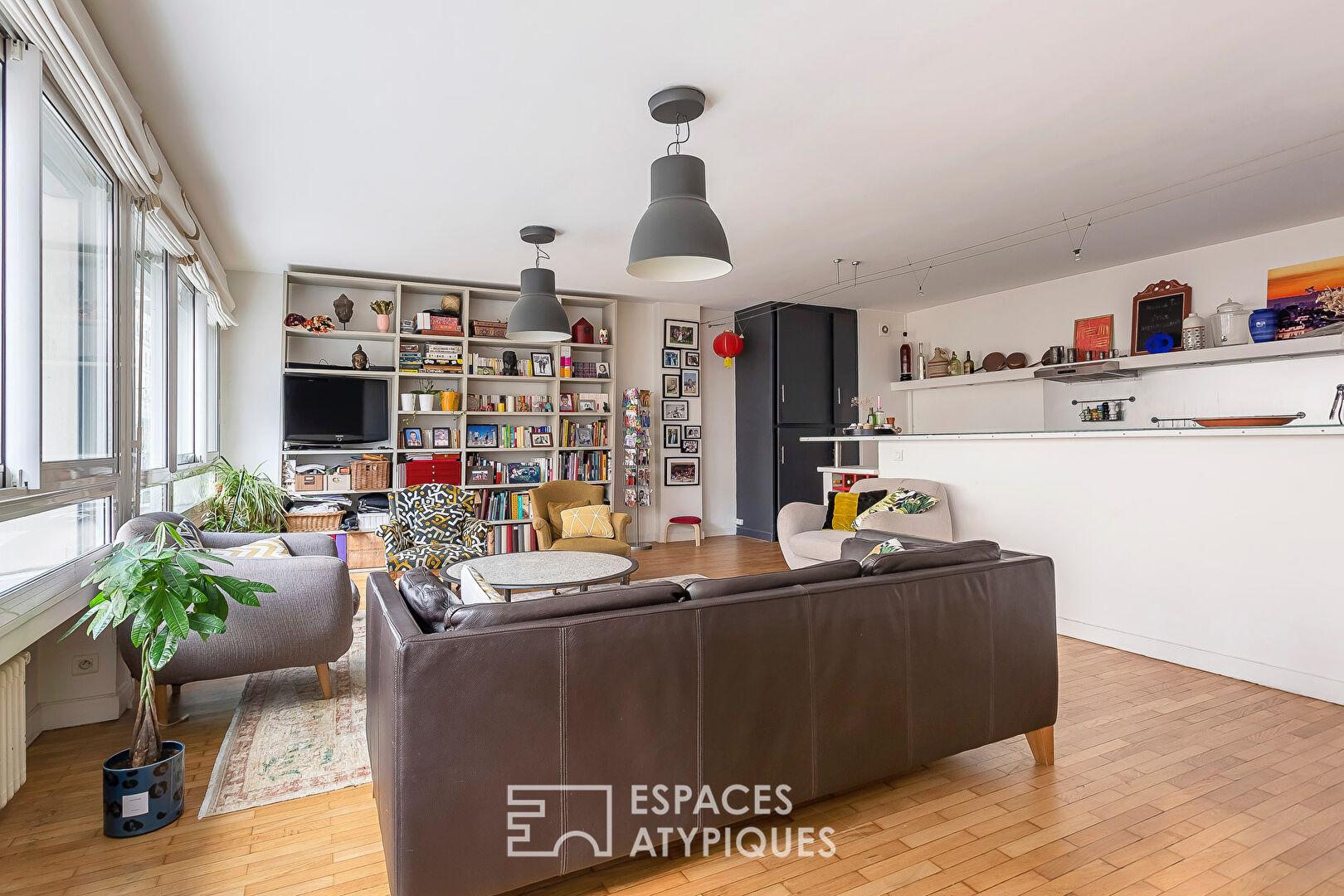Dès l’entrée, le regard est happé par un spectaculaire séjour de 55 m² baigné de lumière, exposé plein sud. La cuisine ouverte, parfaitement intégrée, dialogue avec l’espace de réception dans un esprit contemporain et convivial. Les volumes généreux et la qualité de la rénovation confèrent à l’ensemble une atmosphère à la fois chaleureuse et résolument actuelle.