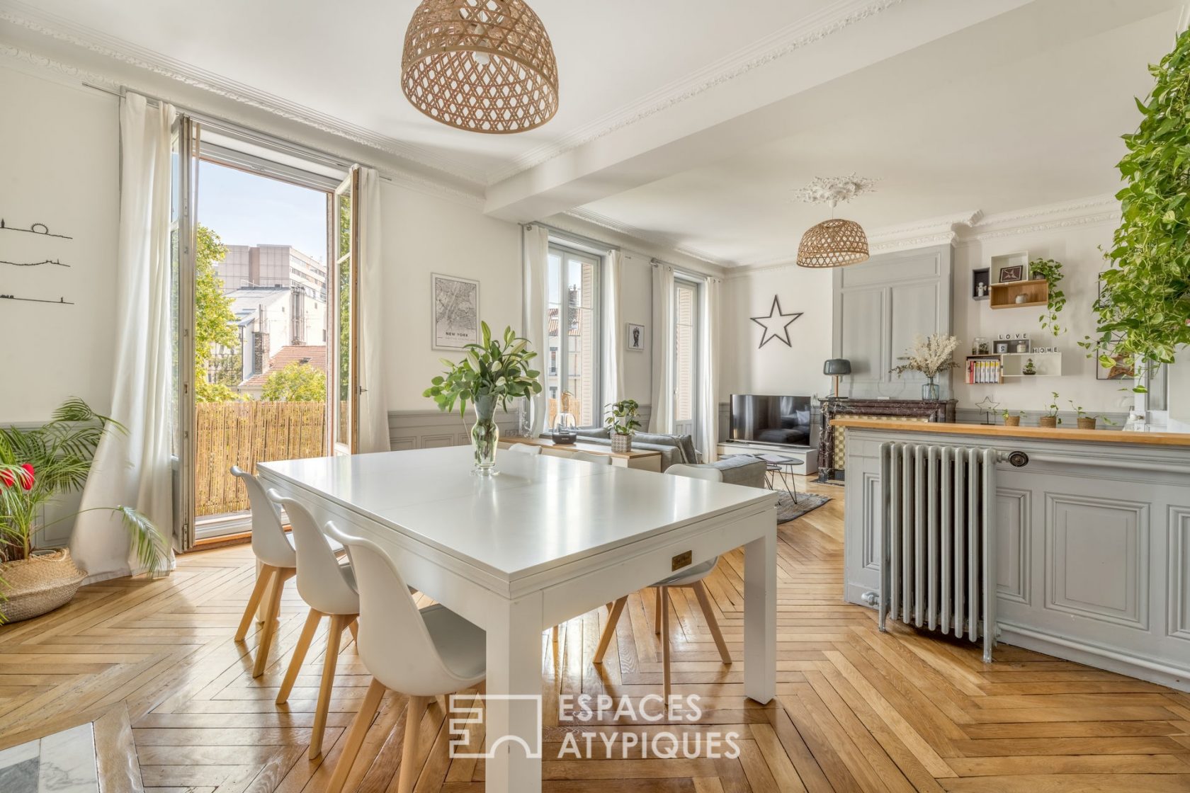 Dès l’entrée, une première chambre prend place. Dans le prolongement du couloir, les codes des appartements Haussmannien sont nettement revendiqués dans la belle pièce de vie : parquet massif à chevrons, moulures, belle hauteur sous plafond, cheminées. Ici, une cuisine immaculée jouxte l’espace dînatoire et le salon.
