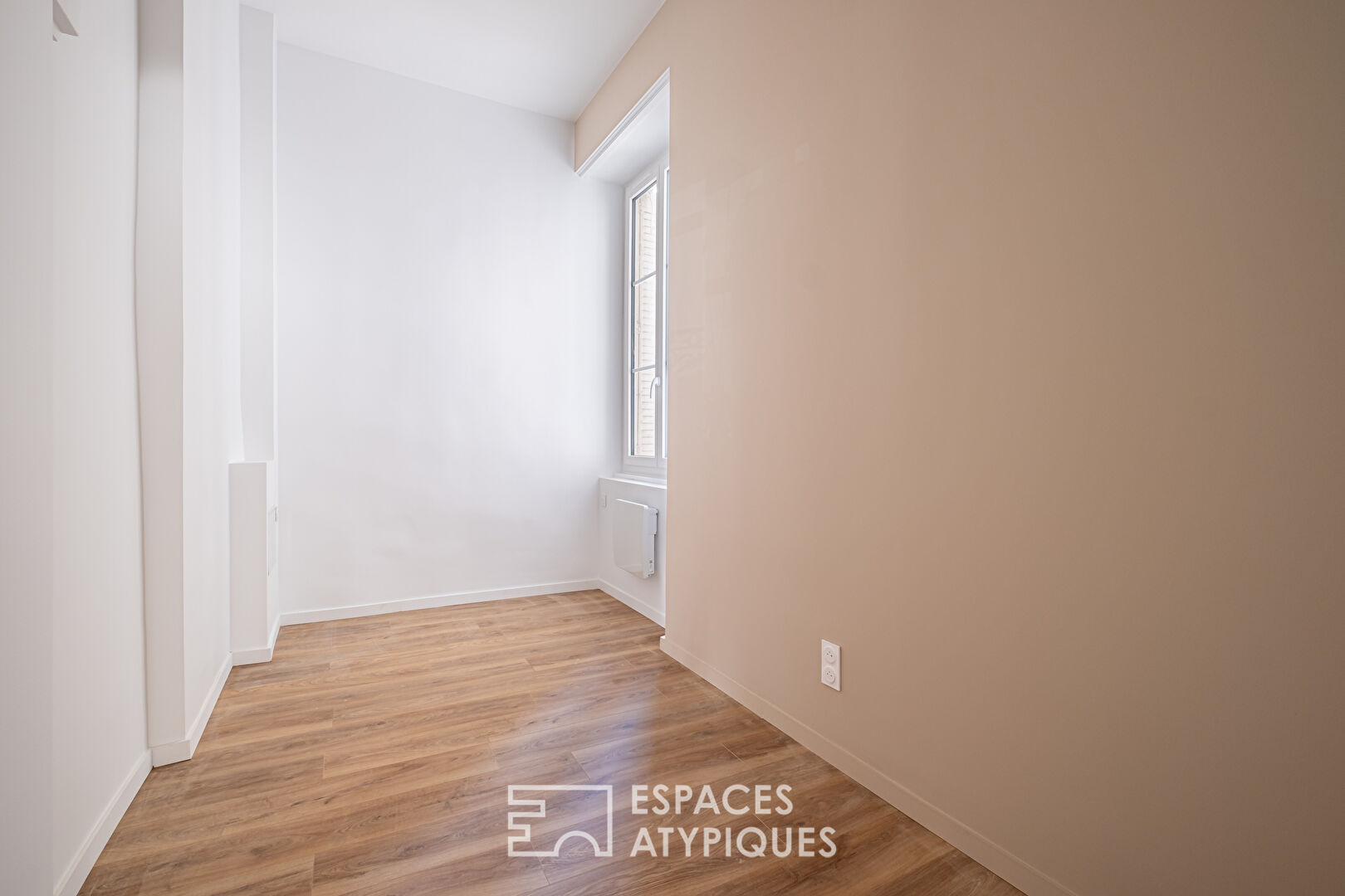 Dès l’entrée, le charme opère. La belle hauteur sous plafond de 3,50m, les moulures d’époque, le parquet massif et la cheminée en marbre rappellent l’élégance des appartements haussmanniens. La pièce de vie, baignée de lumière, accueille une cuisine ouverte aux lignes sobres, parfaitement intégrée à l’ensemble.