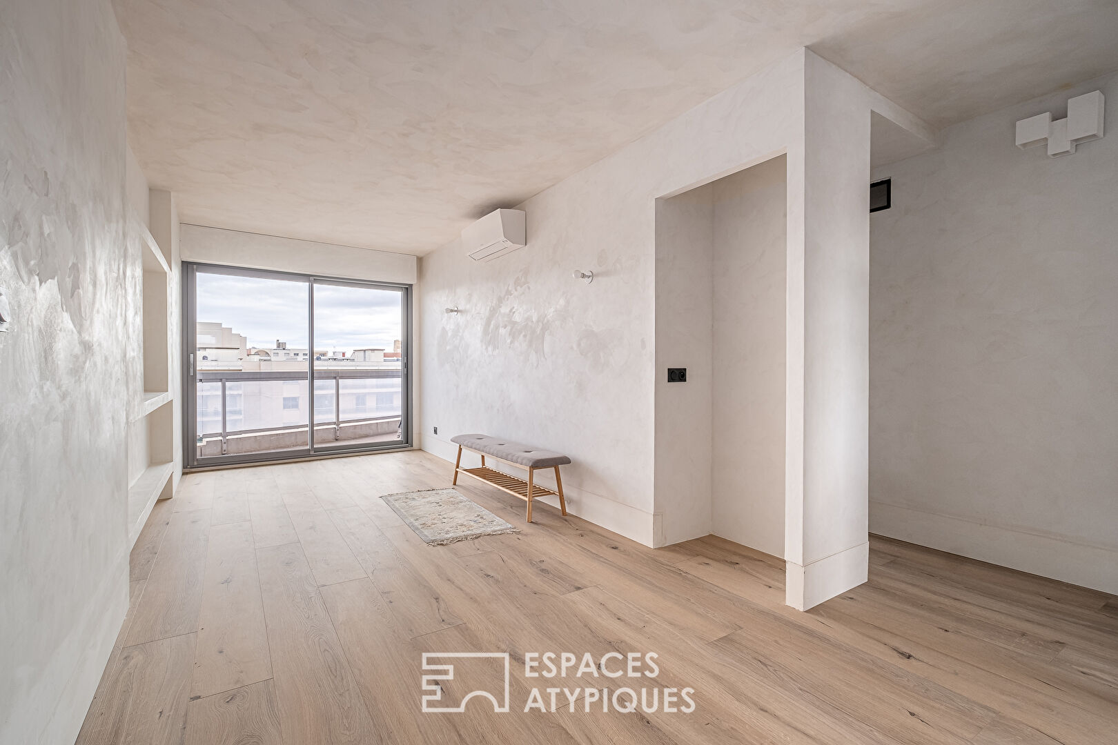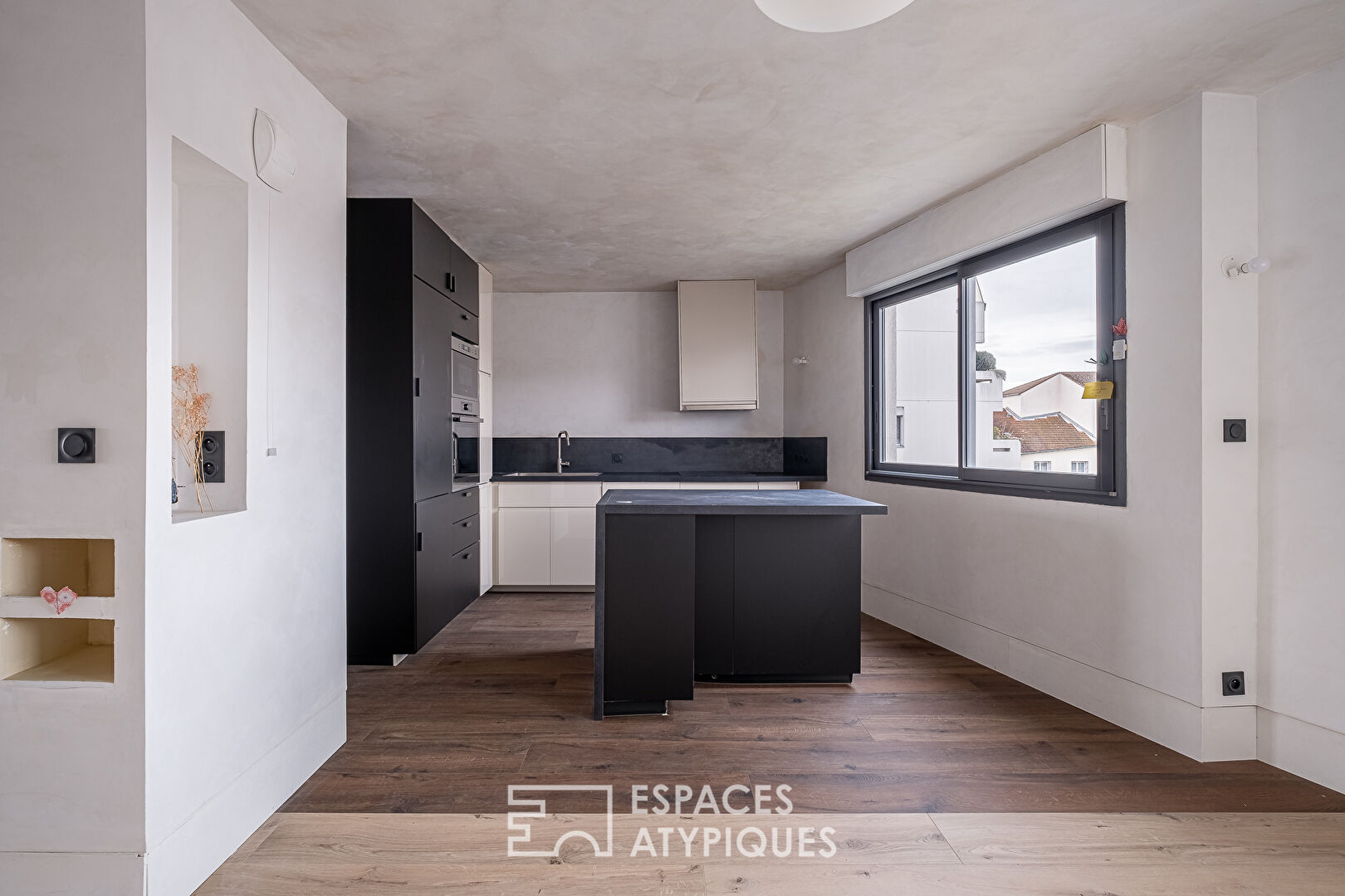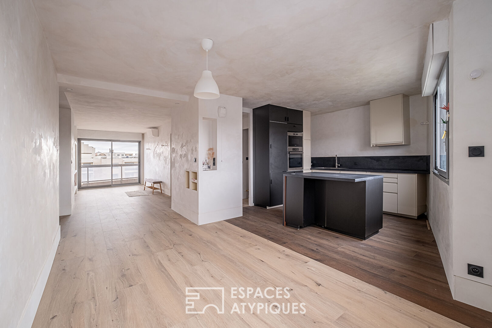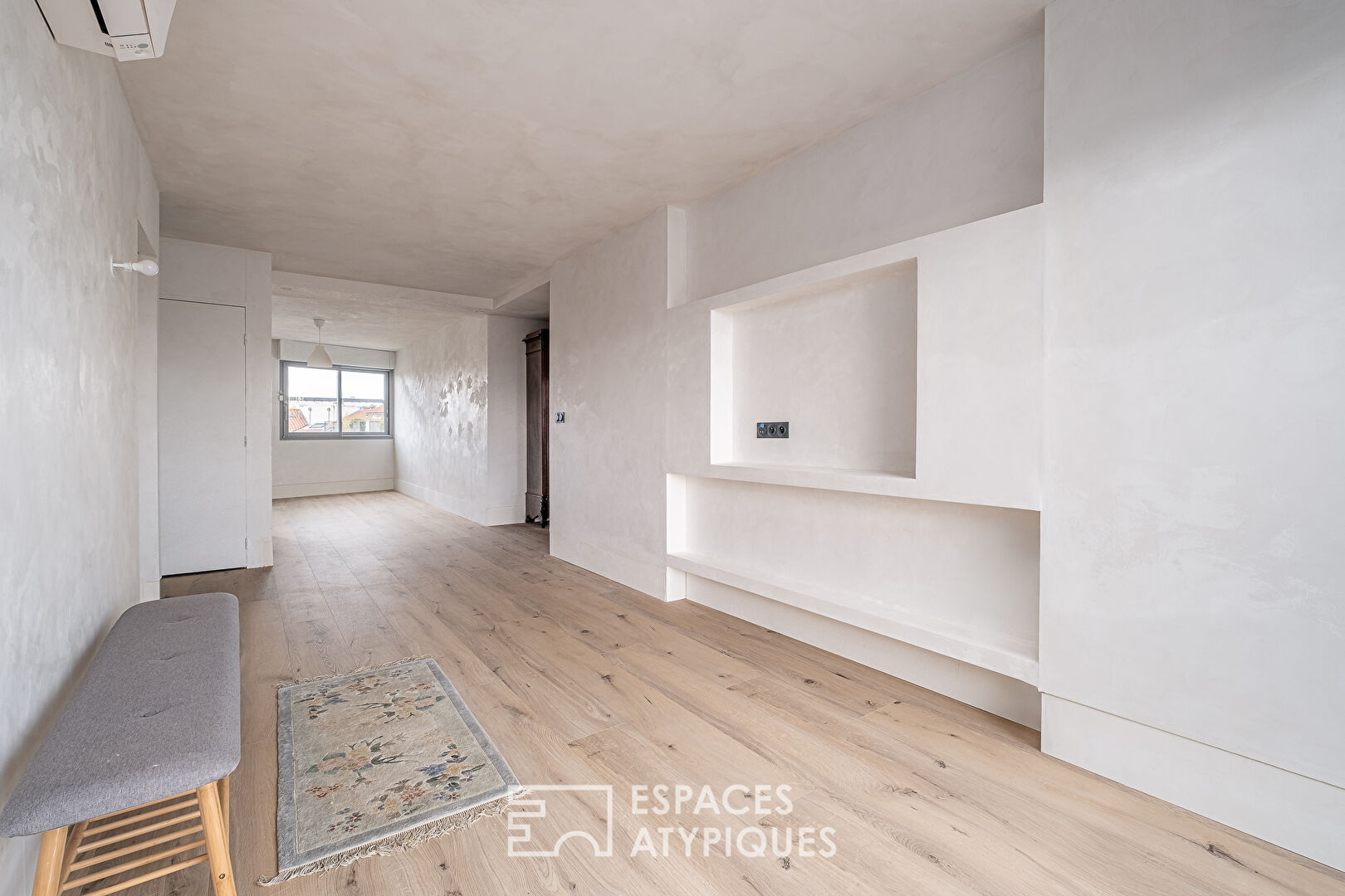 S’ensuit la partie nuit qui se décline au calme, avec deux chambres, dont une parentale dotée d’un accès direct à une salle d’eau double via une porte à galandage.