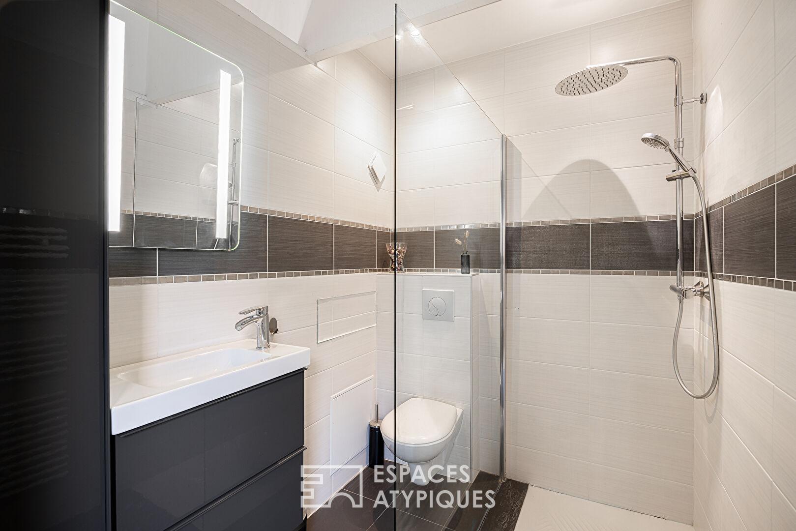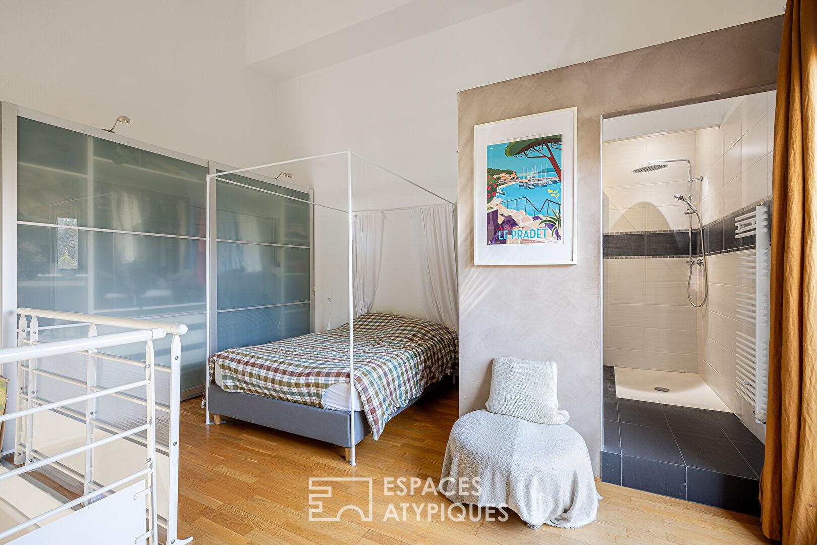 À l’étage, un escalier en colimaçon dessert un espace détente qui précède une suite parentale pensée comme un cocon indépendant : dressing, salle d’eau avec toilettes, et une terrasse en rooftop à l’abri des regards, propice à la détente.