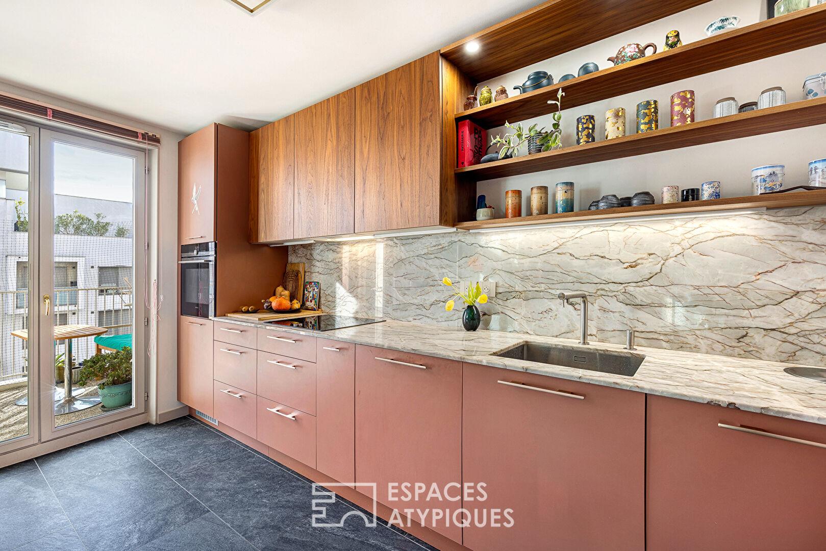 Dès l’entrée, un subtil dégagement avec rangement intégré mène à une cuisine linéaire semi-ouverte, entièrement équipée, qui s’ouvre sur la loggia. Le séjour présente de beaux volumes, structuré autour d’un espace salon et d’une salle à manger, soulignés par des aménagements menuisés sur mesure. Une première chambre confortable avec dressing mural complète ce niveau, ainsi qu’une salle d’eau-buanderie fonctionnelle et des toilettes séparées.