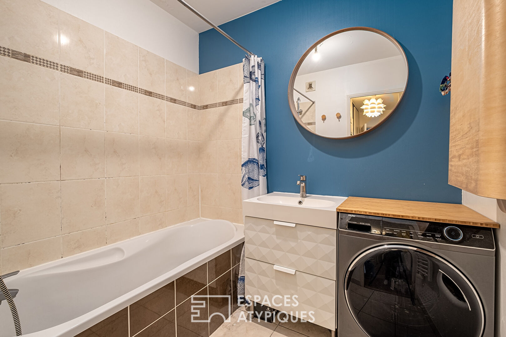 Côté cuisine on retrouve une décoration contemporaine avec du carrelage aspect carreaux de ciment et une belle verrière sur mesure qui accueille subtilement de nombreux rangements.
