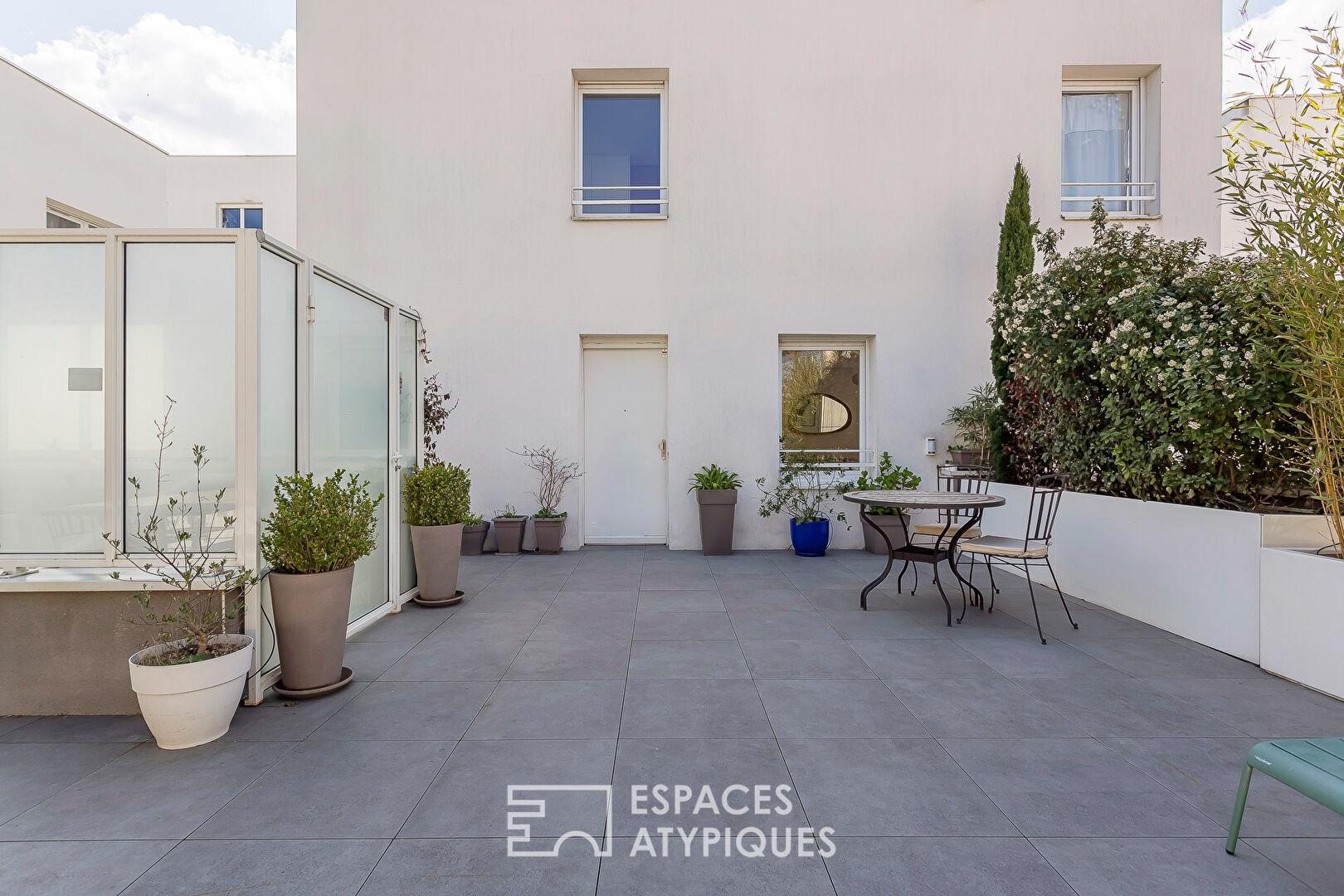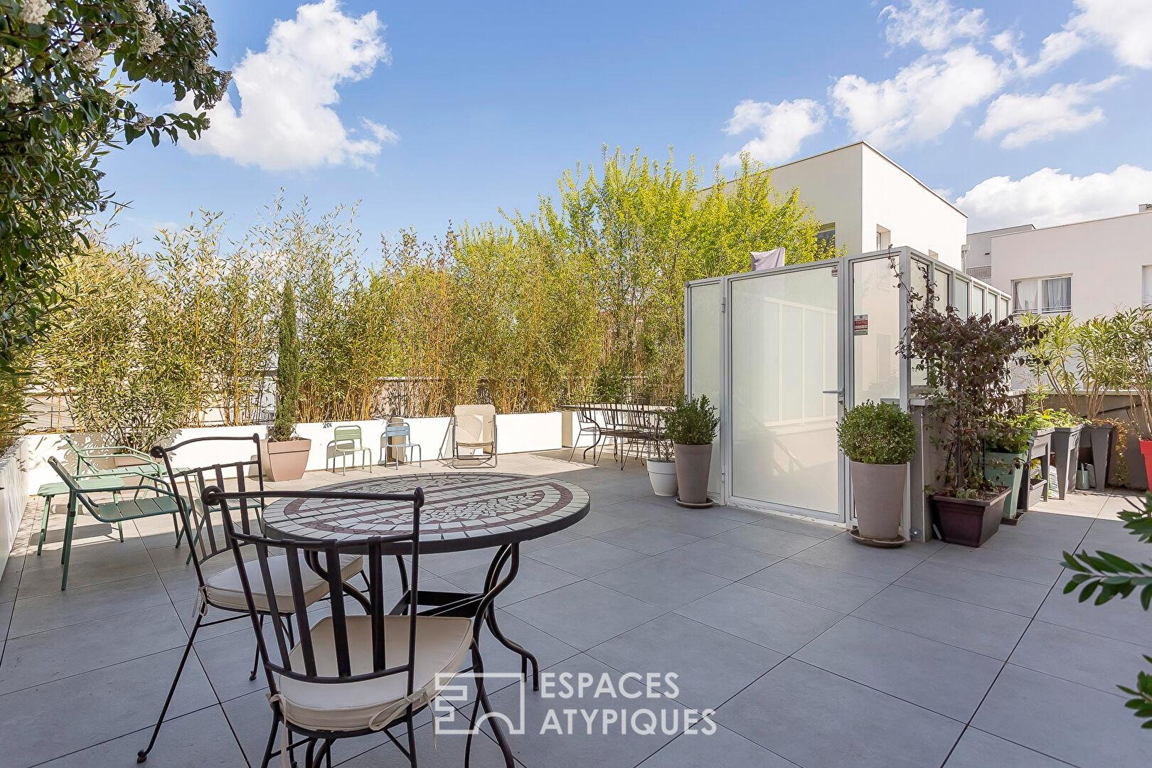 Le véritable atout maître de ce bien reste sa terrasse végétalisée à couper le souffle de 103 m², une surface rare en plein coeur de ville située en coeur d’îlot. Plus qu’un simple balcon, ce jardin suspendu devient une extension naturelle du séjour. Cet espace aux dimensions généreuses permet d’imaginer un salon d’extérieur chaleureux ou un coin repas convivial pour recevoir amis et famille. Sa configuration offre également la liberté d’y installer une pergola ou de cultiver un véritable jardin privé pour profiter du soleil et du calme absolu, à l’abri du tumulte urbain.