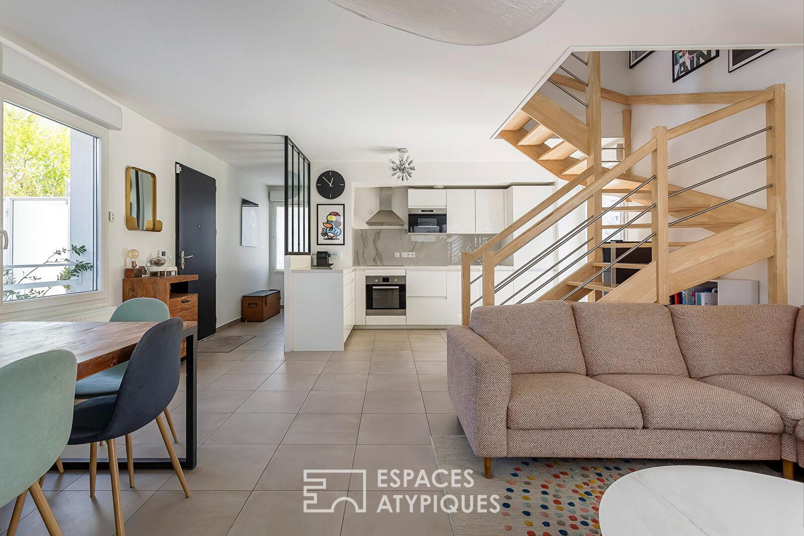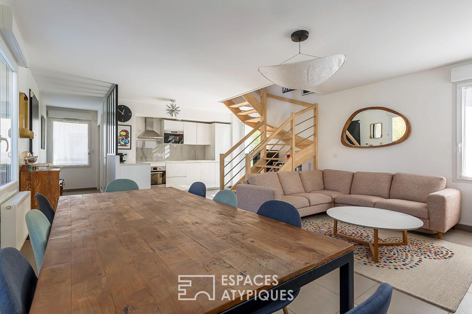 À deux pas du quartier très prisé de Lyon 6ème et des allées verdoyantes du Parc de la Tête d’Or, cet appartement en duplex, achevé en 2019, réinvente les codes de l’habitat urbain. Niché au premier et dernier étage d’une résidence sécurisée, ce bien singulier profite d’un accès indépendant qui renforce immédiatement cette sensation d’exclusivité et de discrétion.