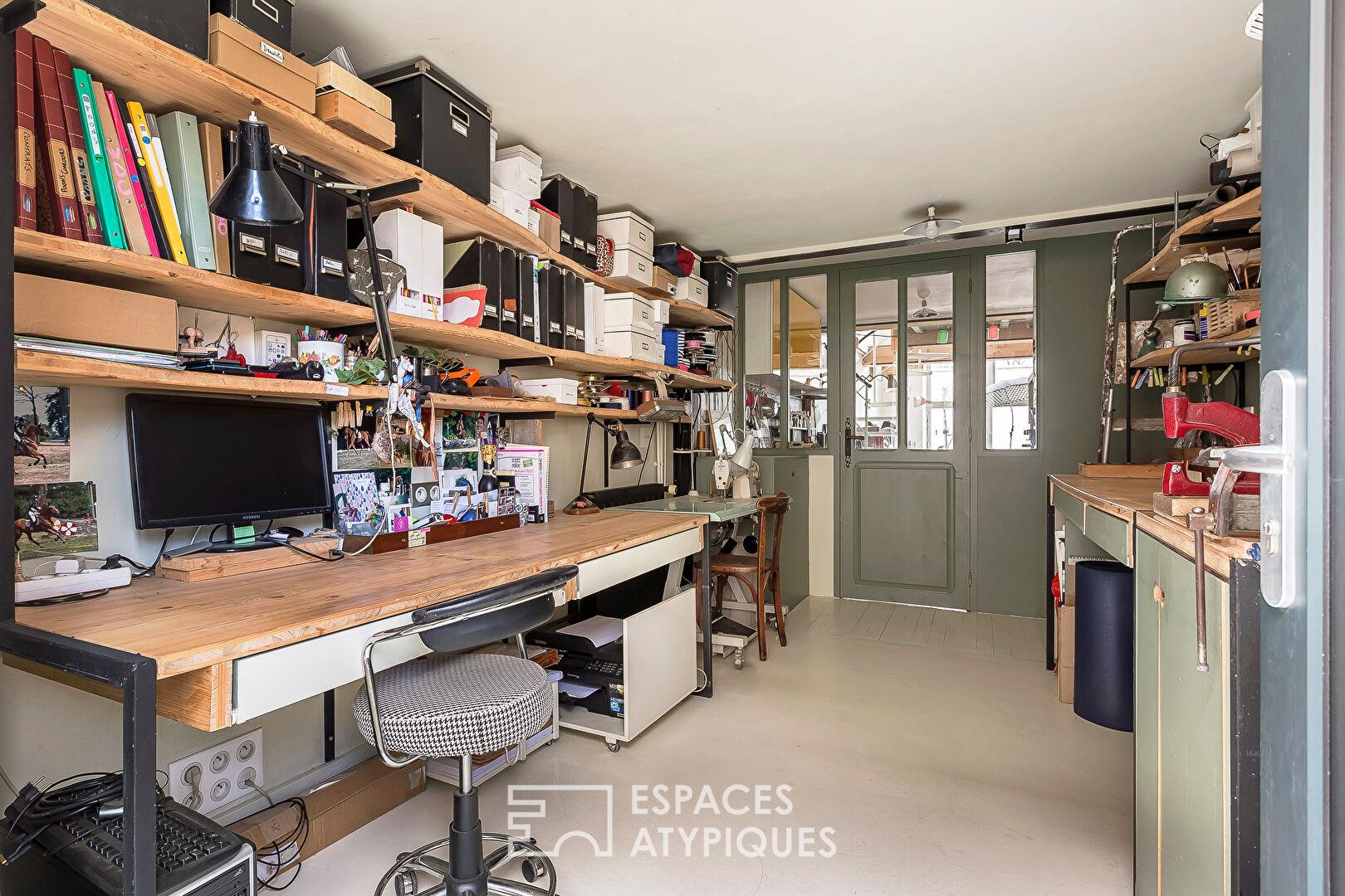 Le rez-de-chaussée accueille également une salle de bain avec douche et baignoire, ainsi qu’un atelier, aujourd’hui espace polyvalent, pouvant aisément se transformer en chambre, bureau ou studio de création selon les besoins.