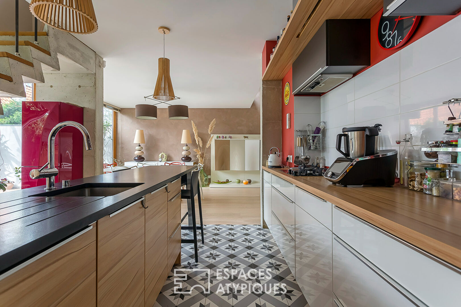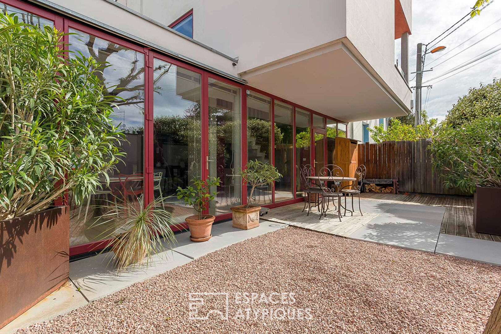 Située à Villeurbanne, à proximité de l’INSA , cette maison d’architecte en triplex de 154 m² prend place sur un terrain de 270m².