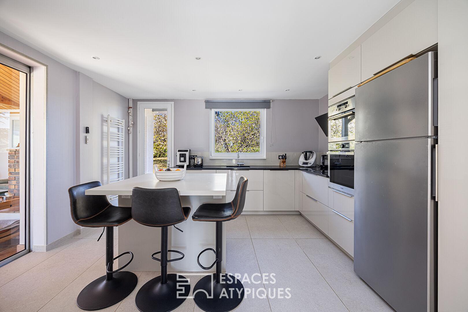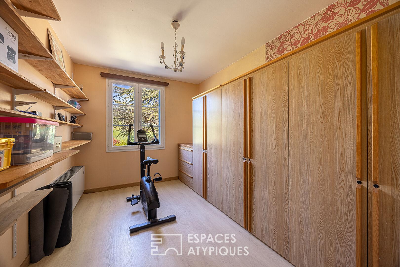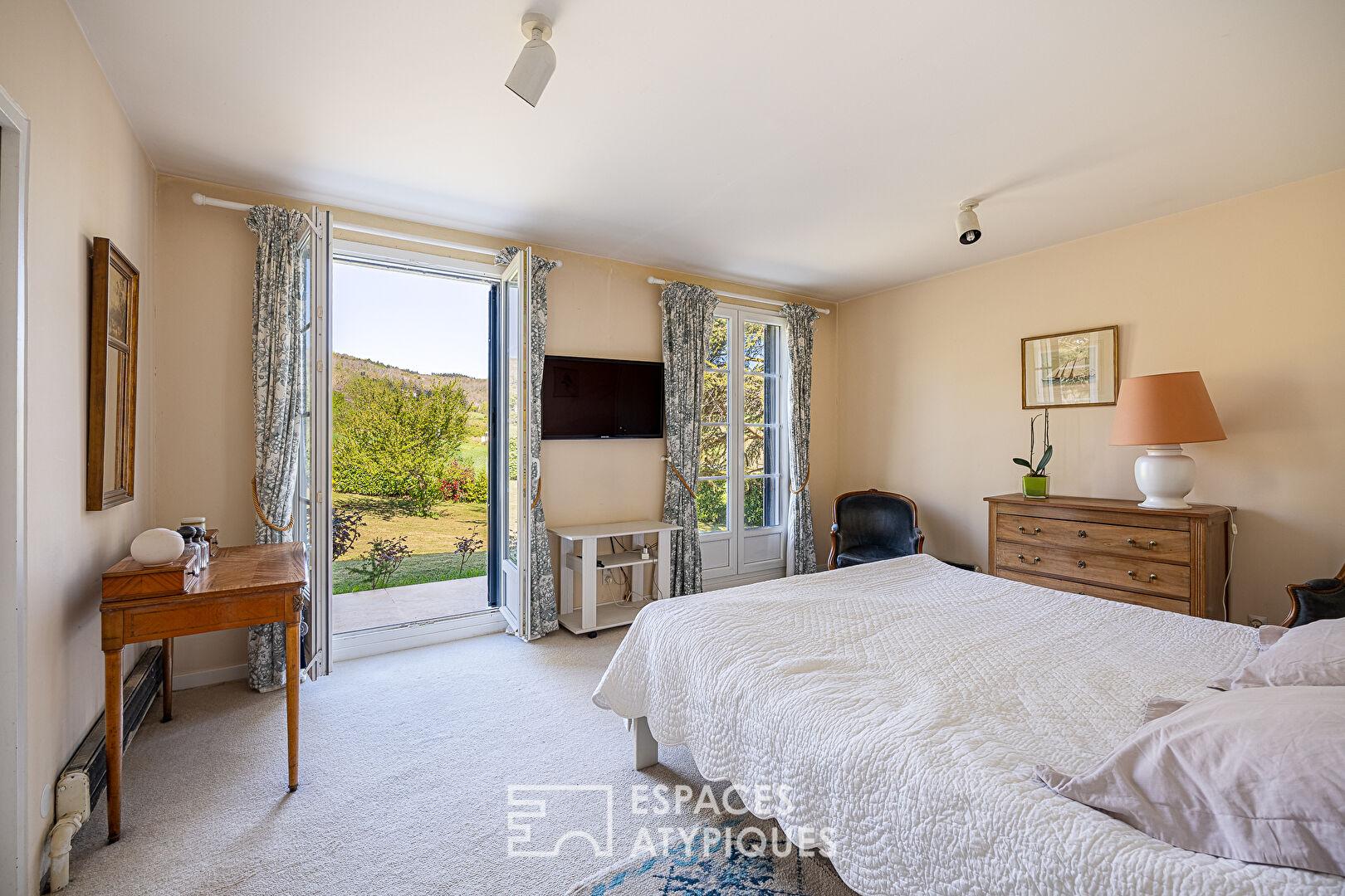 À l’extérieur, le jardin arboré, véritable écrin de verdure, s’étend autour de la maison et accueille une agréable terrasse tournée vers la piscine. L’environnement bucolique, calme et sans vis-à-vis, renforce le caractère ressourçant du lieu.