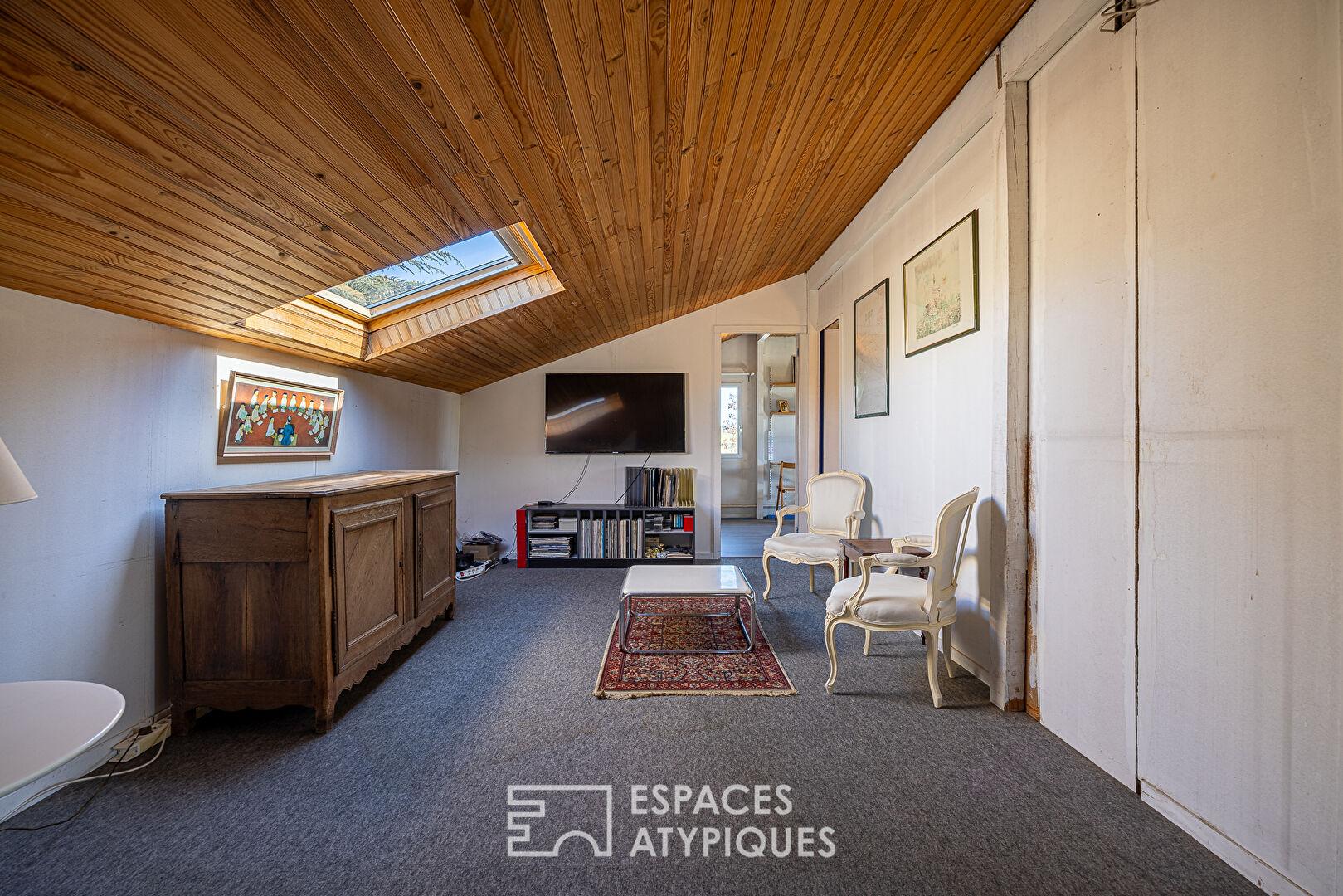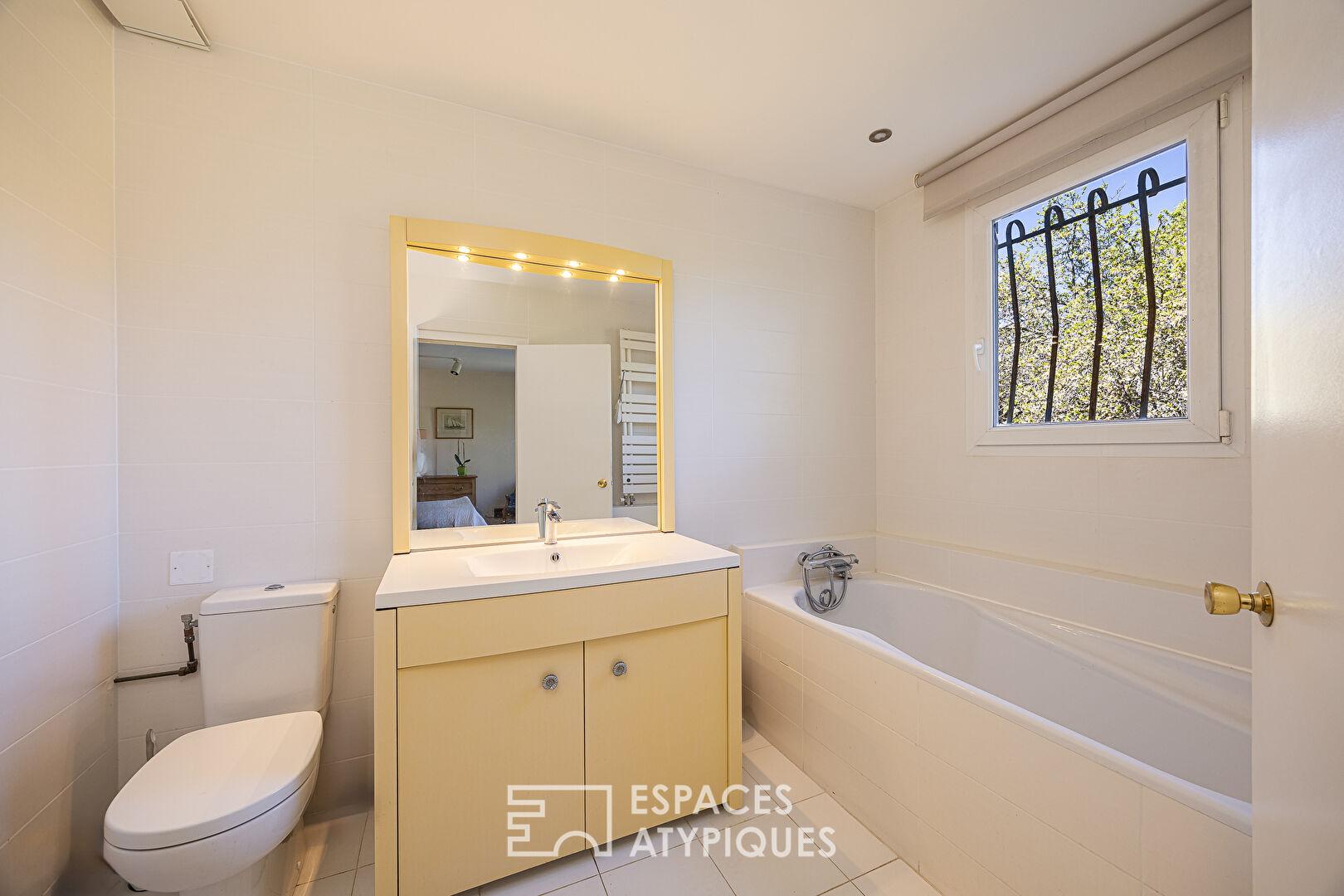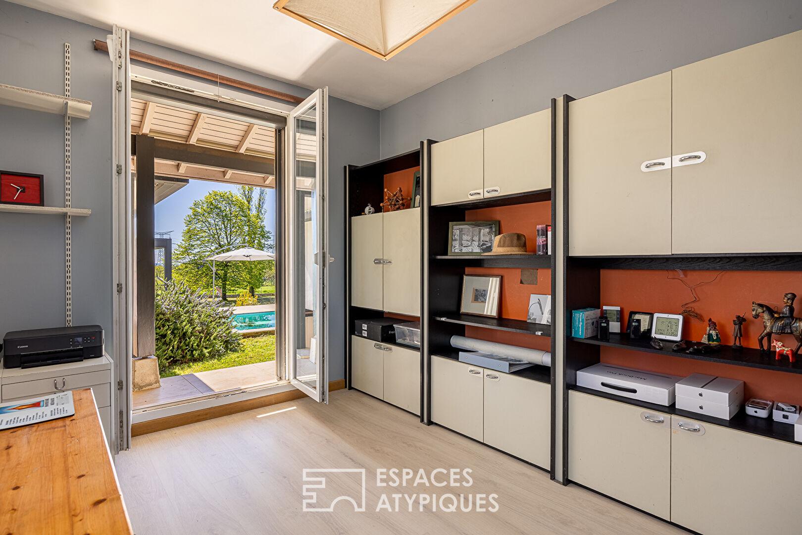 À l’extérieur, le jardin arboré, véritable écrin de verdure, s’étend autour de la maison et accueille une agréable terrasse tournée vers la piscine. L’environnement bucolique, calme et sans vis-à-vis, renforce le caractère ressourçant du lieu.