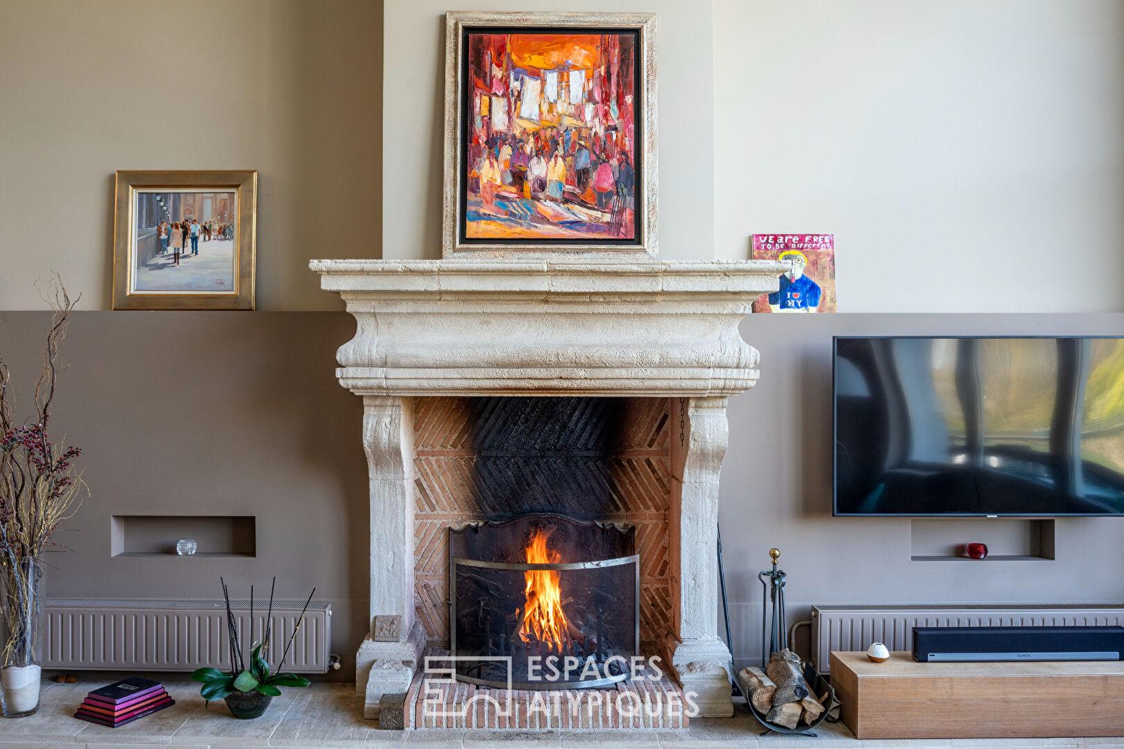 Le salon de 50 m² et ses 6m de hauteur sous plafond, pièce maîtresse de ce bien d’exception, offre une vue imprenable sur l’Île Barbe et la Saône, cadrées comme un tableau par une immense baie vitrée ouvrant sur un balcon.