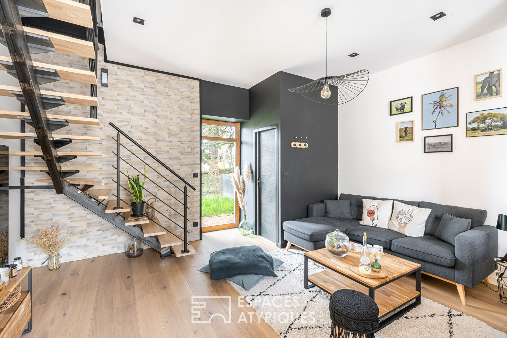 L’entrée, par le jardin privatif, nous ouvre les portes d’un espace de vie cosy où le salon ouvert sur la salle à manger et la cuisine ont été pensés et optimisés de la meilleure des manières.