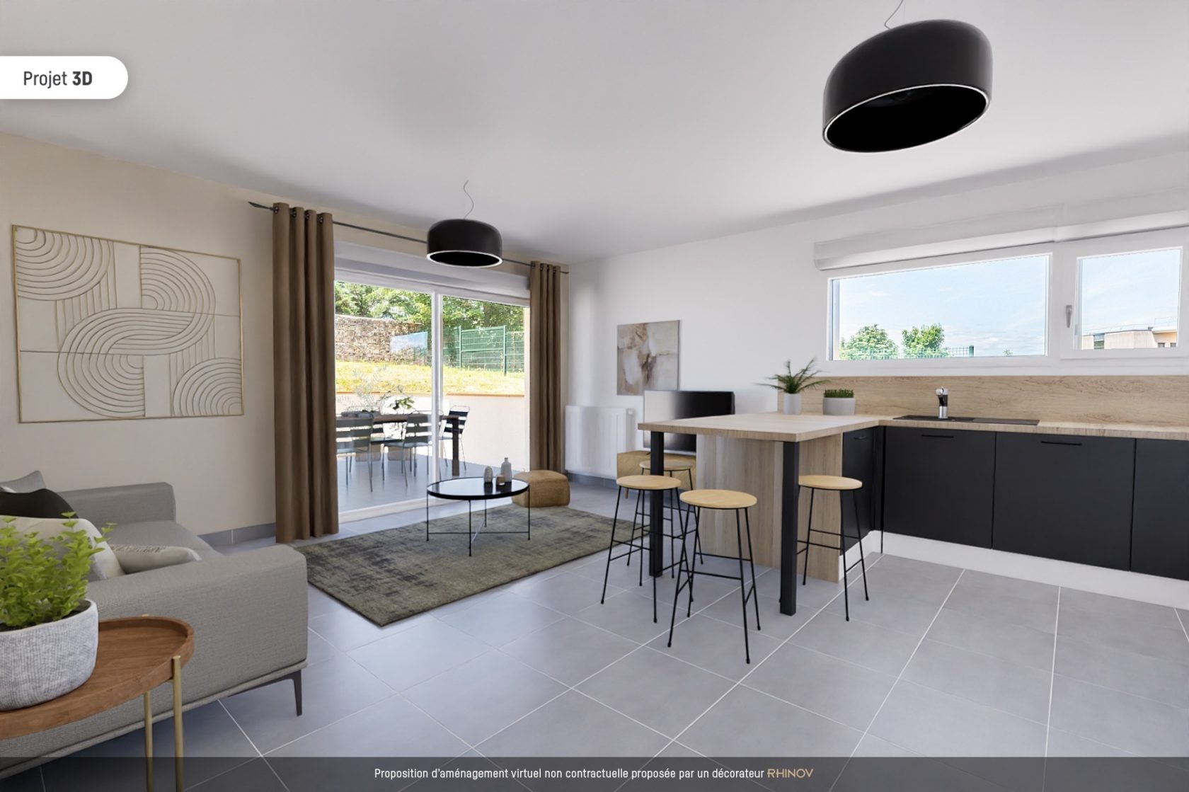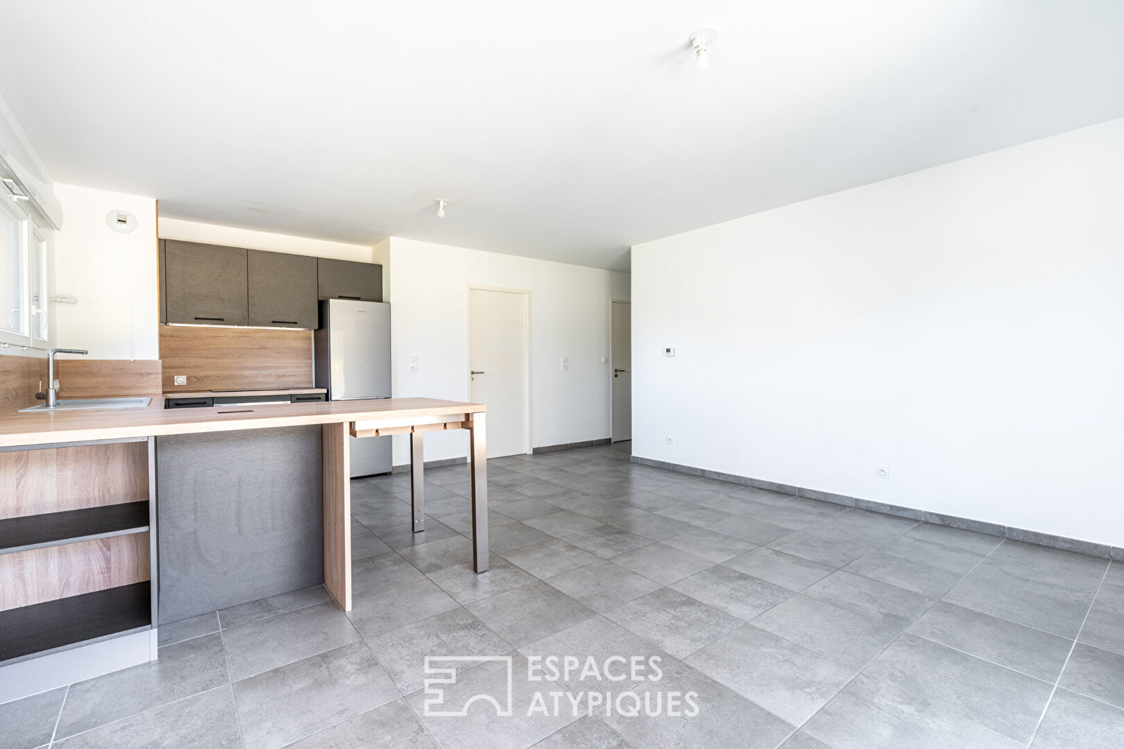 La cuisine contemporaine est ouverte sur un joli salon, créant un espace de vie convivial pour les moments en famille ou entre amis. L’accès direct à la terrasse offre une véritable pièce supplémentaire dès l’arrivée des beaux jours.