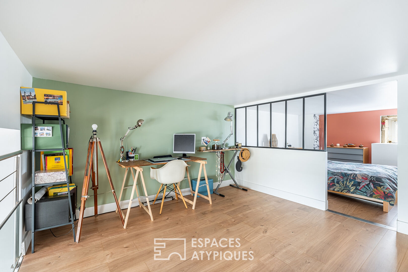 La mezzanine est un espace polyvalent et lumineux qui abrite un espace bureau fonctionnel, parfait pour travailler dans un cadre inspirant tout en bénéficiant de la vue sur le séjour et les murs en pierre. La mezzanine accueille également une troisième chambre, cosy et intime, offrant un espace de repos supplémentaire.