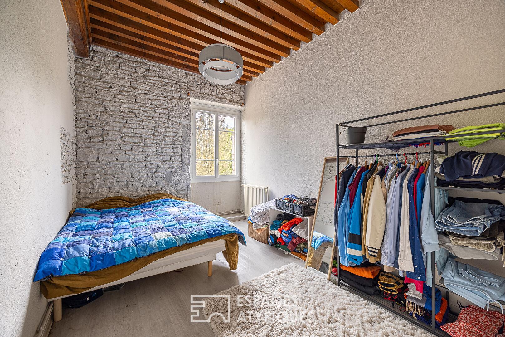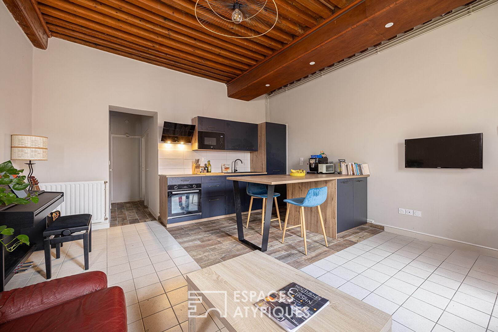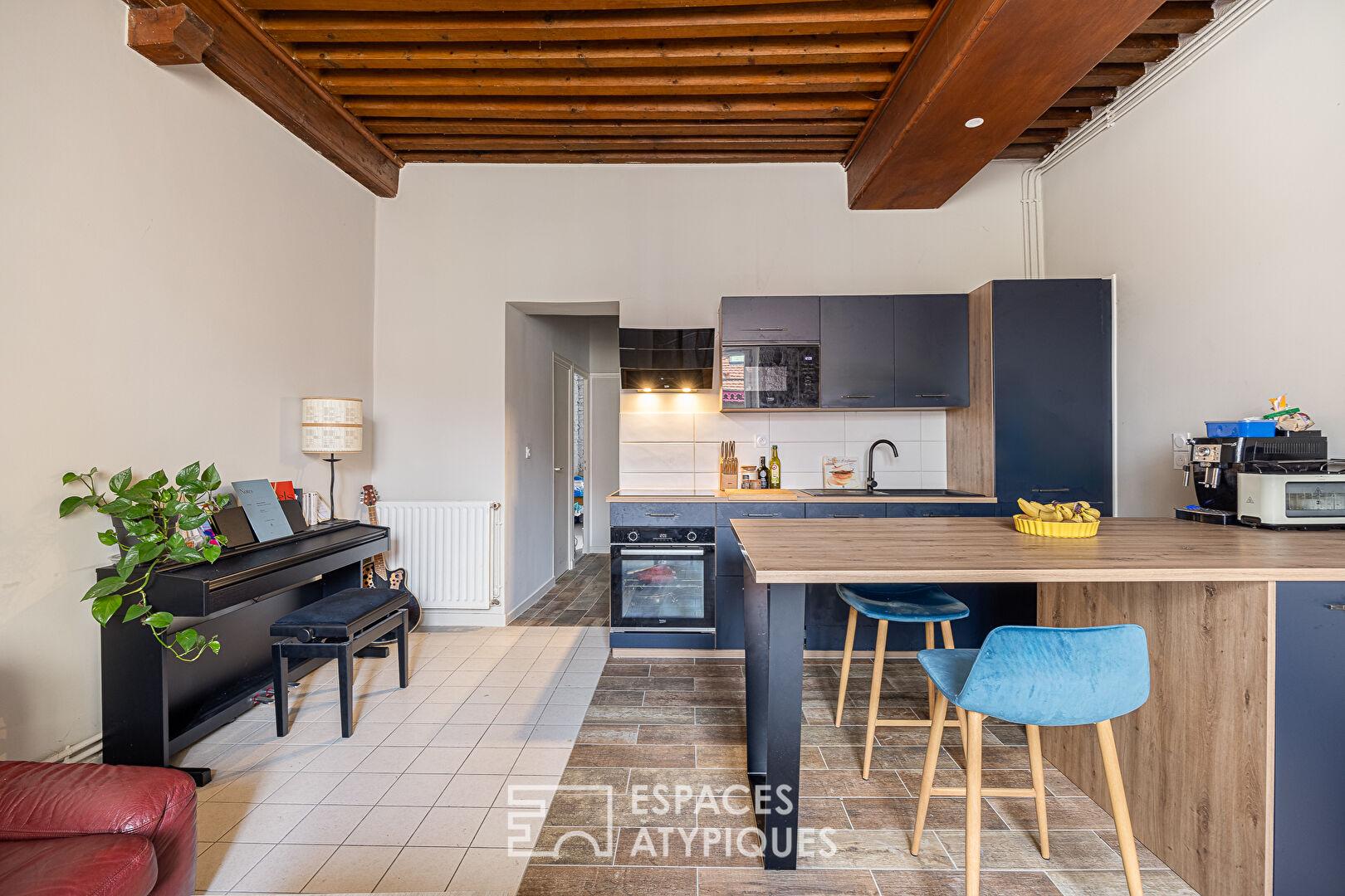 L’entrée s’ouvre sur une pièce de vie conviviale, composée d’un séjour et d’une cuisine ouverte, pensée pour favoriser les échanges et la fluidité des circulations. L’ensemble est sublimé par un plafond à la française aux poutres apparentes, apportant une véritable signature architecturale et un charme authentique. La cuisine aménagée et équipée s’intègre harmonieusement à l’espace de vie.