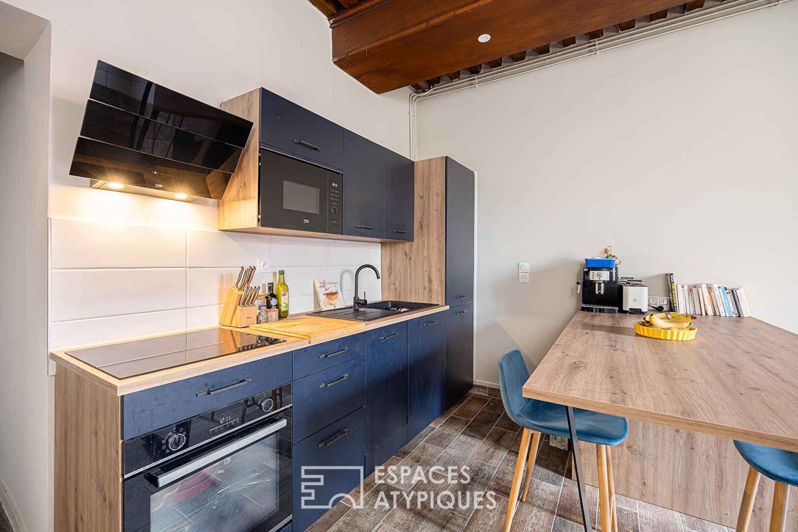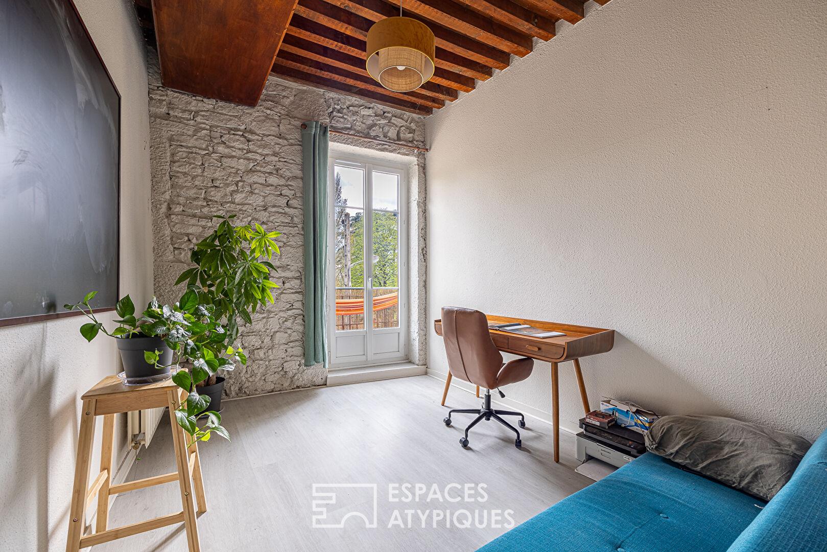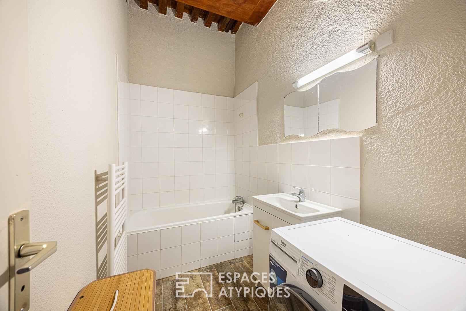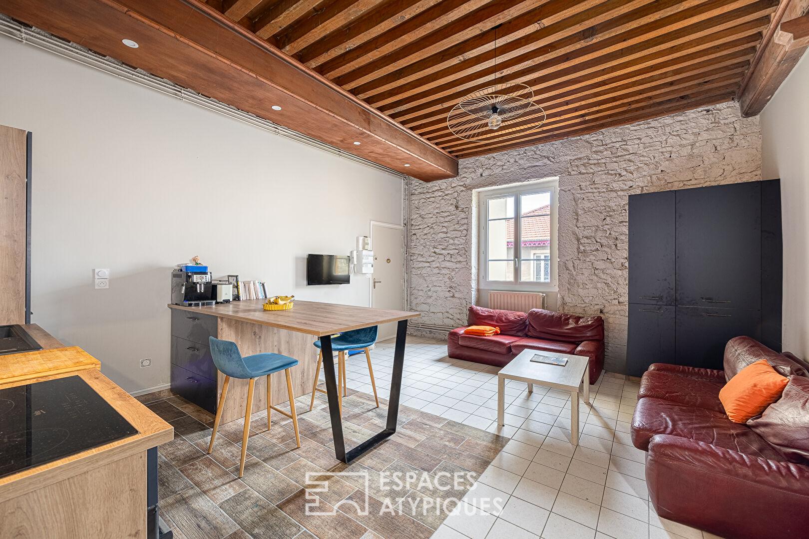 L’entrée s’ouvre sur une pièce de vie conviviale, composée d’un séjour et d’une cuisine ouverte, pensée pour favoriser les échanges et la fluidité des circulations. L’ensemble est sublimé par un plafond à la française aux poutres apparentes, apportant une véritable signature architecturale et un charme authentique. La cuisine aménagée et équipée s’intègre harmonieusement à l’espace de vie.