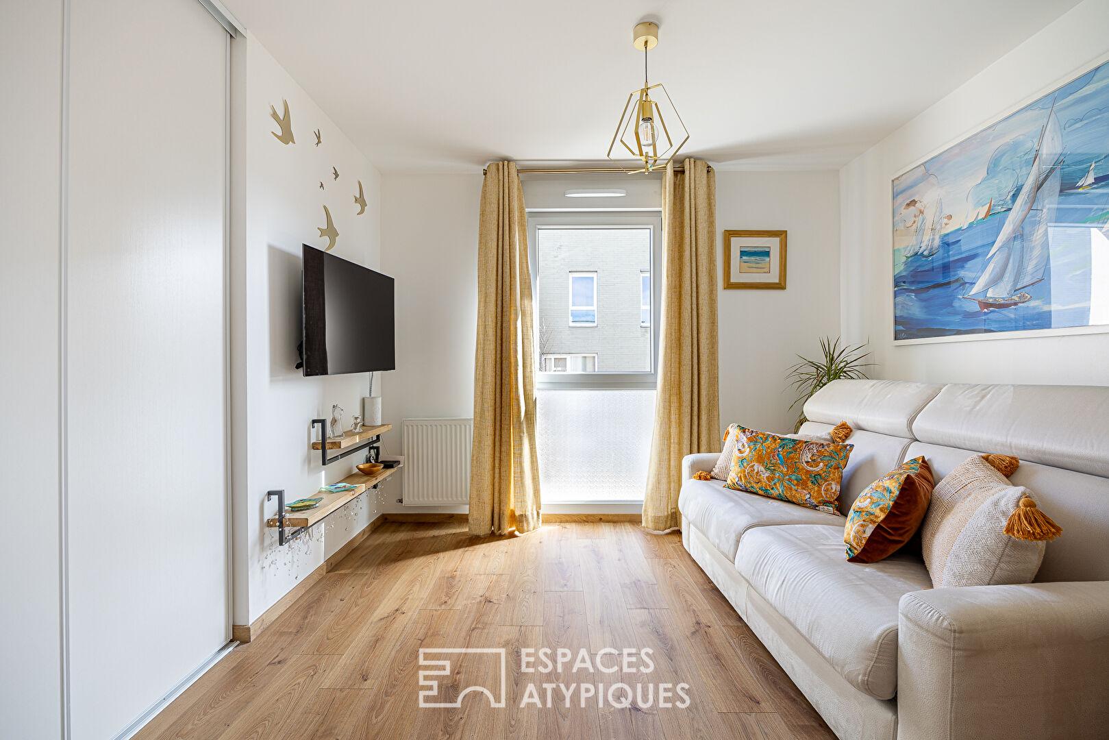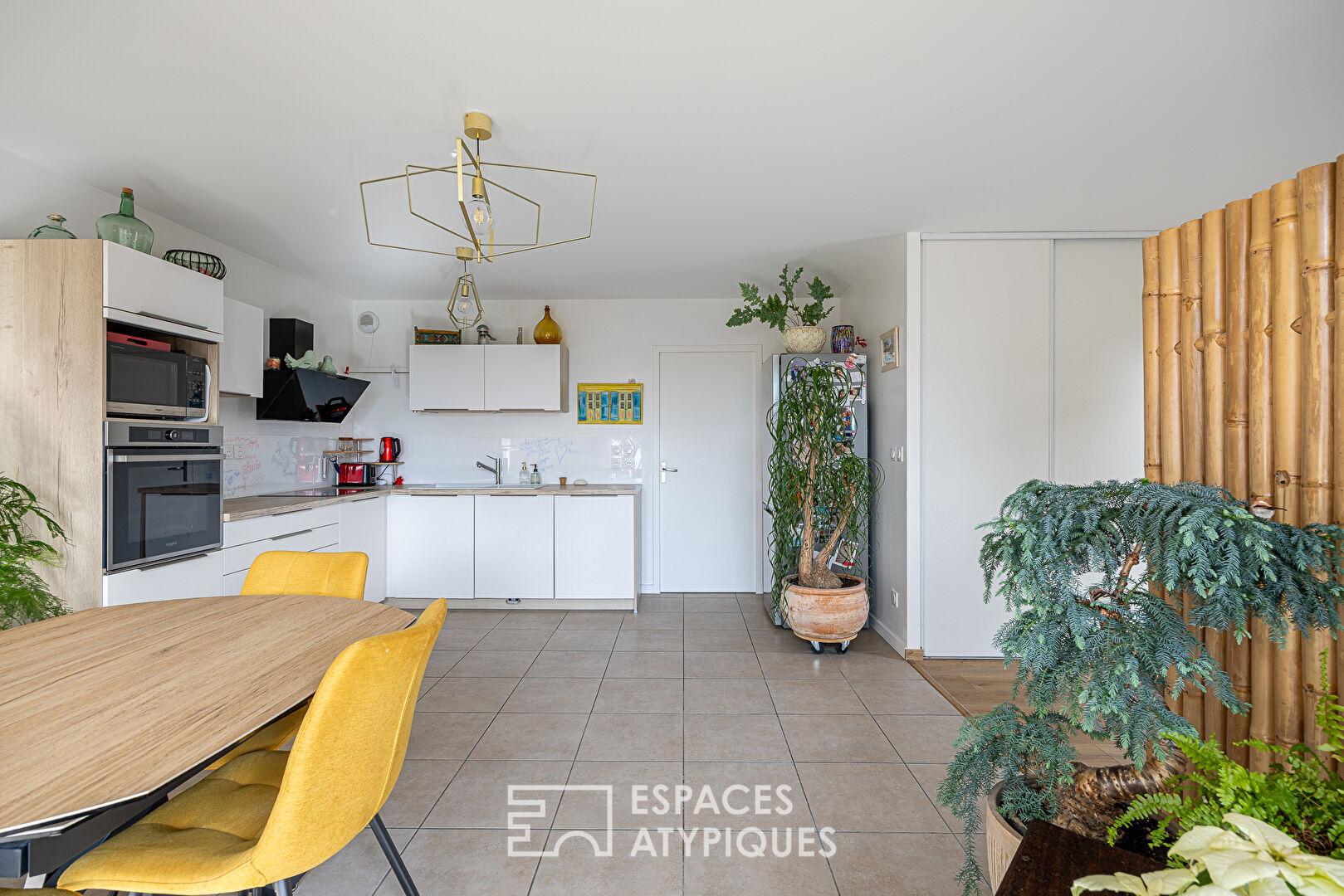 L’entrée mène à un espace de vie lumineux, sublimé par une exposition idéale et une vue dégagée. Le séjour, aux lignes épurées, s’ouvre naturellement sur une cuisine contemporaine et équipée, pensée comme un véritable lieu de convivialité. Les prestations soignées confèrent à l’appartement un confort immédiat, sans travaux à prévoir.