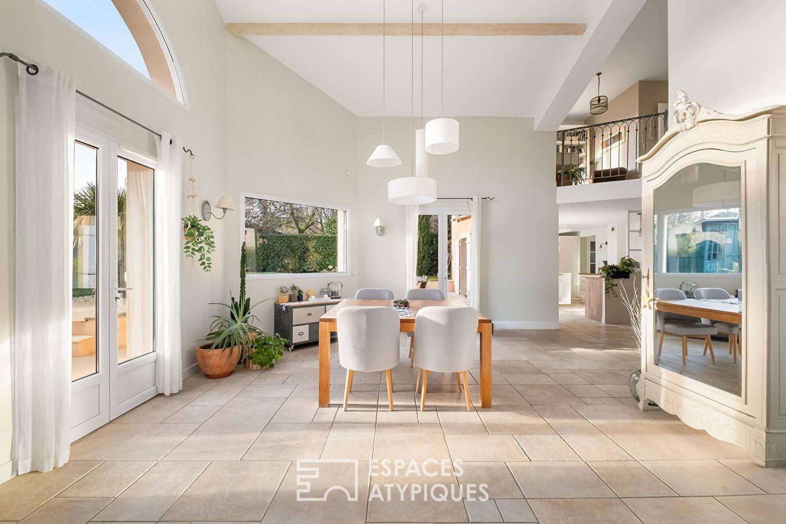 Dès l’entrée, les espaces intérieurs séduisent par leur luminosité et leur agencement fluide. Le séjour cathédrale, exposé plein Sud, accueille un espace salle à manger convivial, sublimé par une belle hauteur sous plafond et des ouvertures sur le jardin. La cuisine, généreuse et fonctionnelle, s’inscrit dans une dynamique de vie quotidienne confortable.
