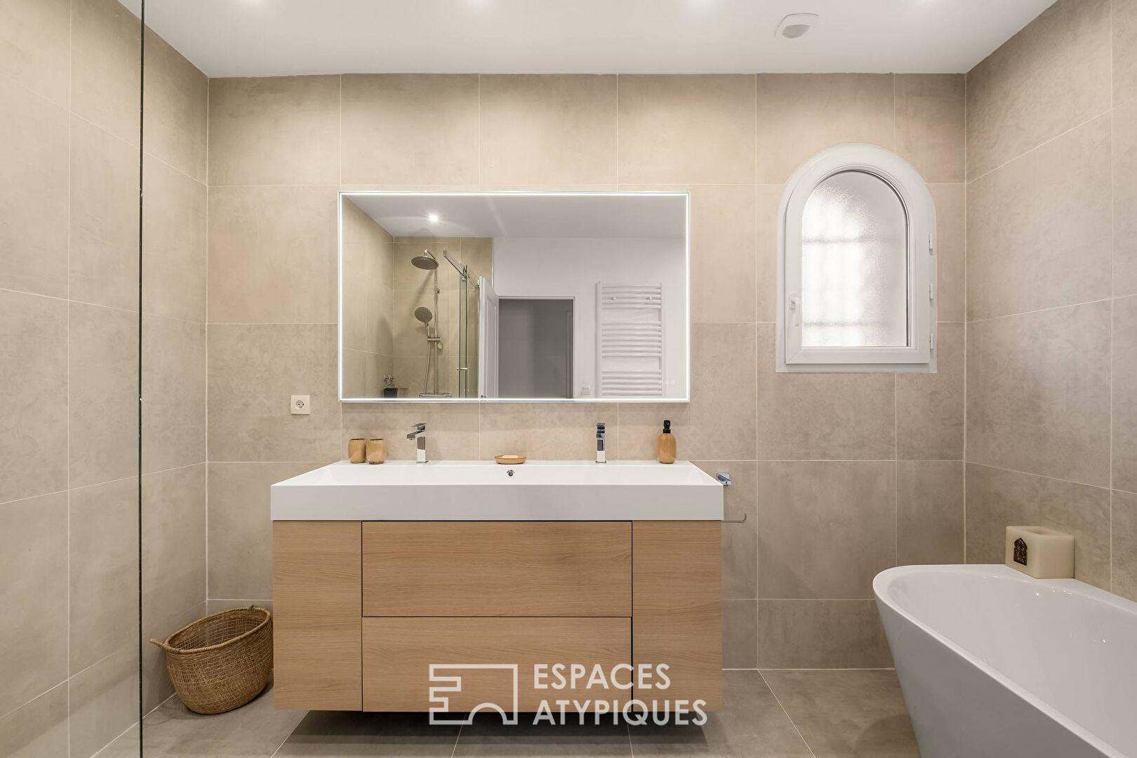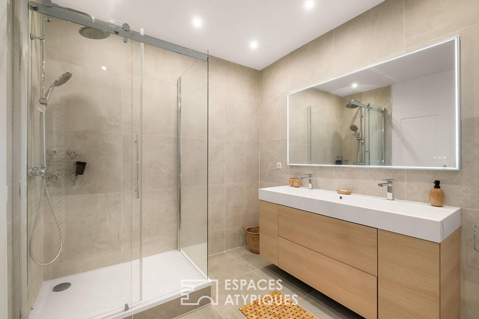 À l’étage, trois chambres équipées de dressings sur mesure, une mezzanine de 12,70 m² aménagée en bureau et une salle de bains avec double vasque, baignoire et douche complètent l’ensemble.
