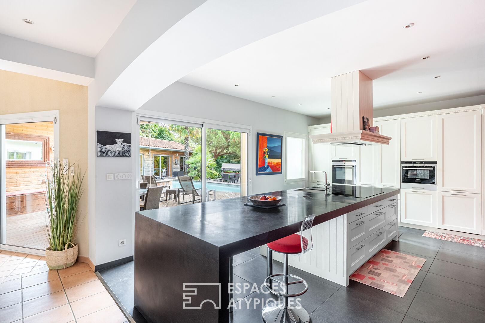 La cuisine, conviviale et fonctionnelle, s’ouvre naturellement sur les espaces de vie et sur l’extérieur avec une vue sur la piscine.