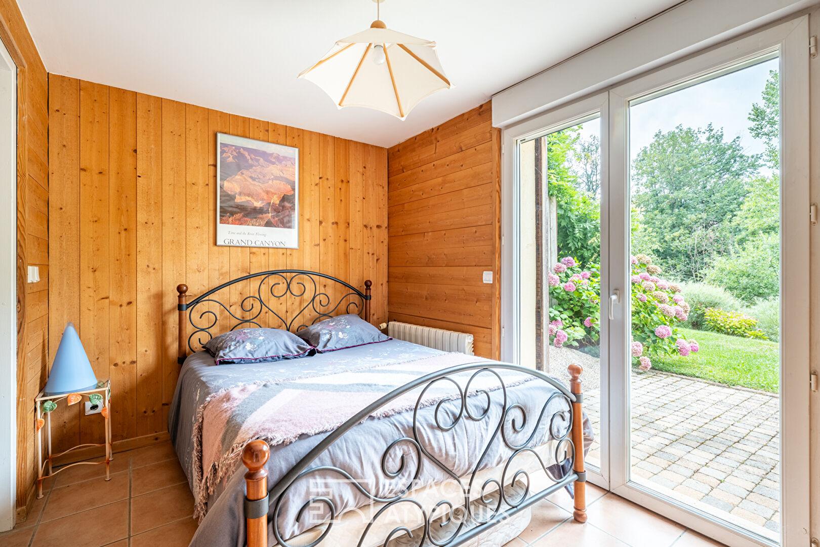 En contrebas, le rez-de-jardin accueille un nouvel espace de vie indépendant, avec séjour, chambre et salle de bain, parfait pour recevoir, télétravailler, ou laisser libre cours à des projets personnels.