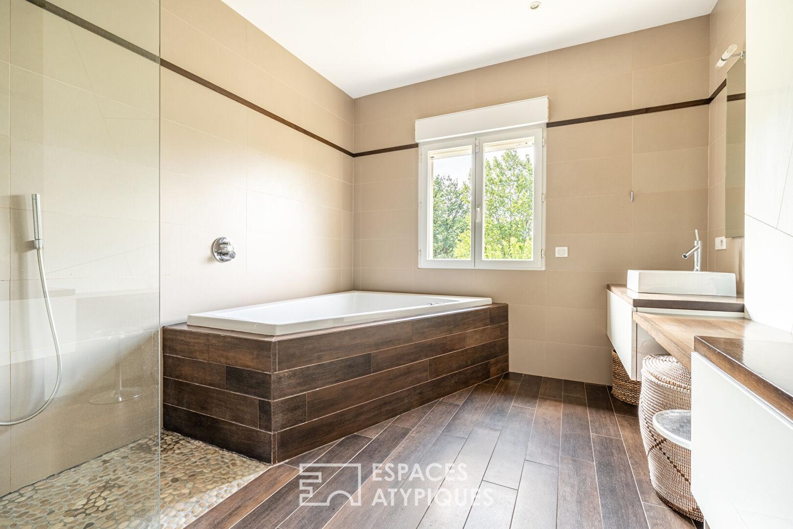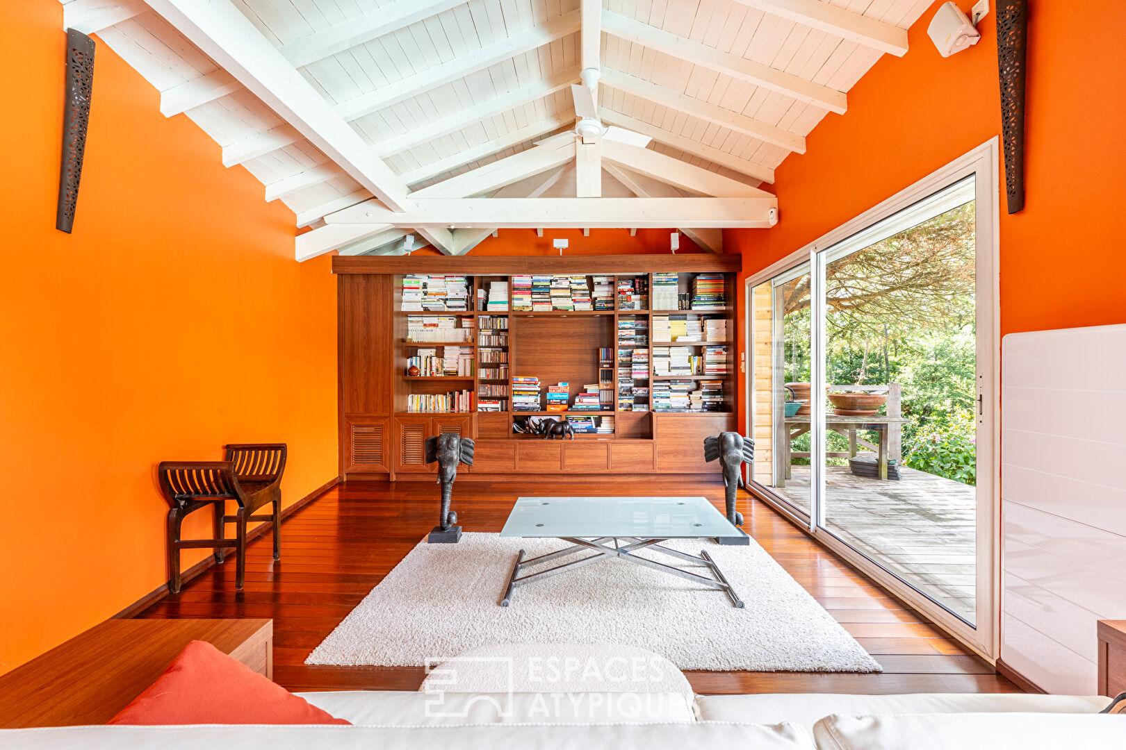 Cette maison de plain-pied s’affirme d’emblée comme un lieu de vie hors normes, pensé comme une oeuvre vivante. Chaque espace raconte une intention, chaque volume invite à un usage singulier.