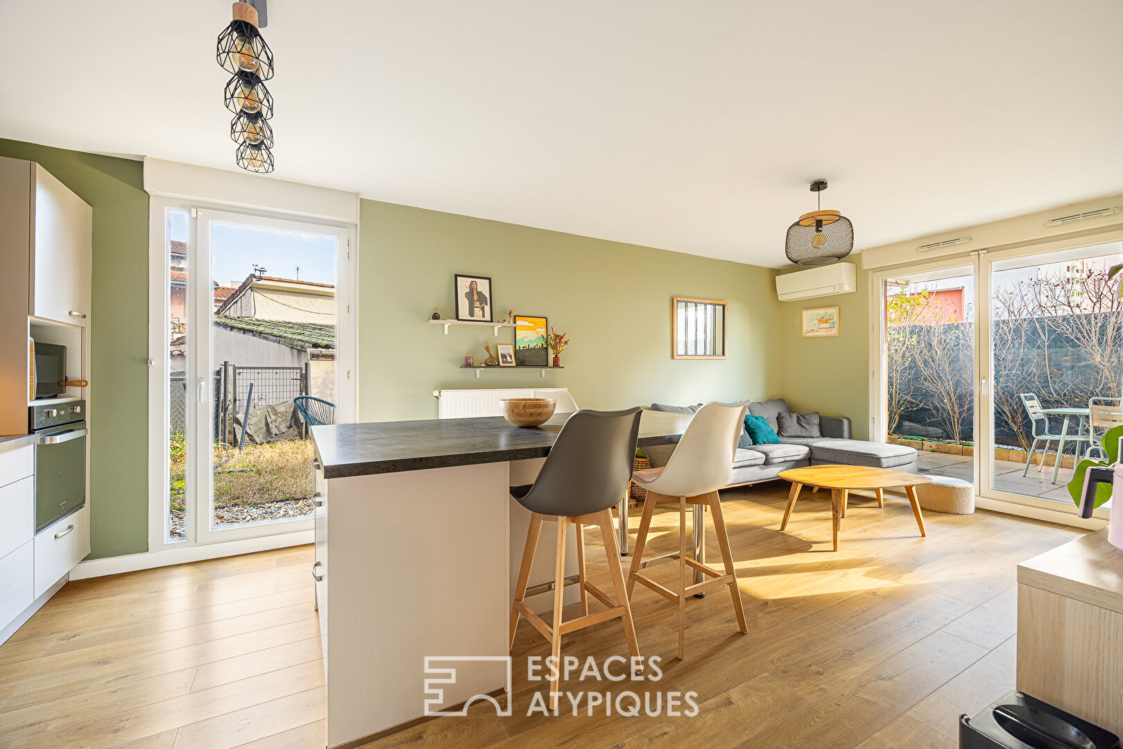 Baigné de lumière, il développe un séjour avec cuisine ouverte de 37 m², chaleureux et fonctionnel, prolongé par une terrasse et jardin en L de 70 m² un véritable havre de verdure accessible depuis toutes les pièces, rare en appartement.
