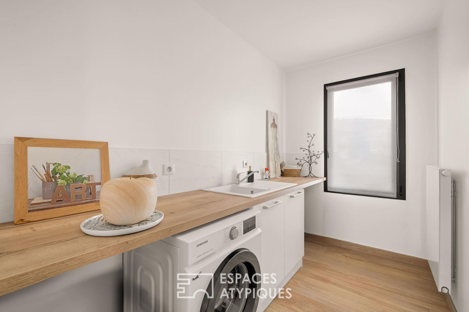 Une salle de bains aux lignes contemporaines, ainsi qu’une buanderie indépendante, complètent ce niveau.