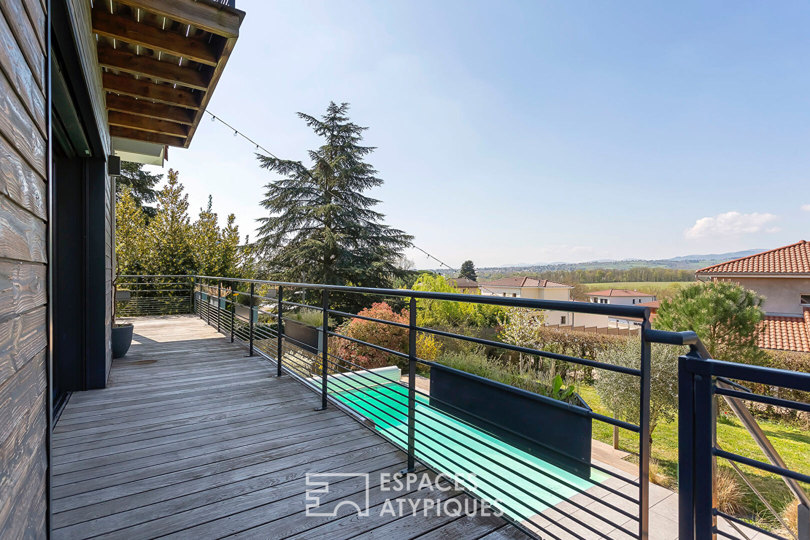 Sur une parcelle de 715 m², elle déploie sa silhouette affirmée sur trois niveaux baignés de lumière, orientés vers le sud-ouest, où la piscine 8×4 s’impose comme l’épicentre des beaux jours.
