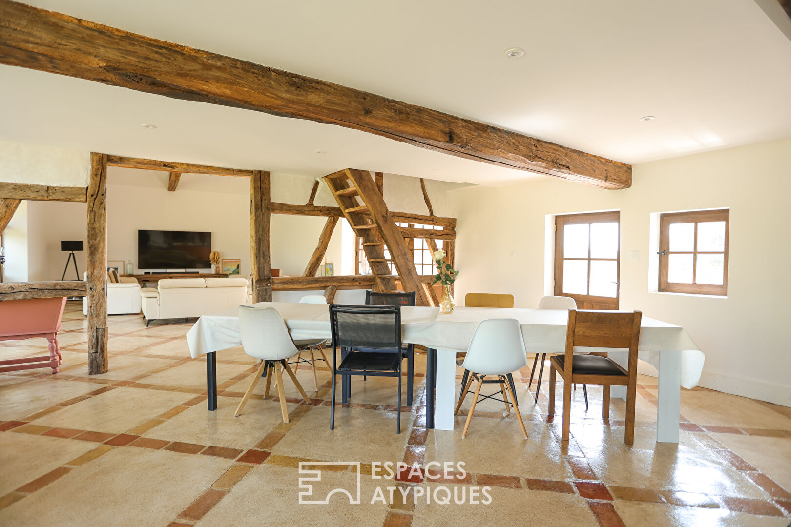 Séparée par une élégante ancienne cheminée, une immense pièce de vie cathédrale baignée de lumière où les baies vitrées invitent à profiter du tableau extérieur au fil des saisons.