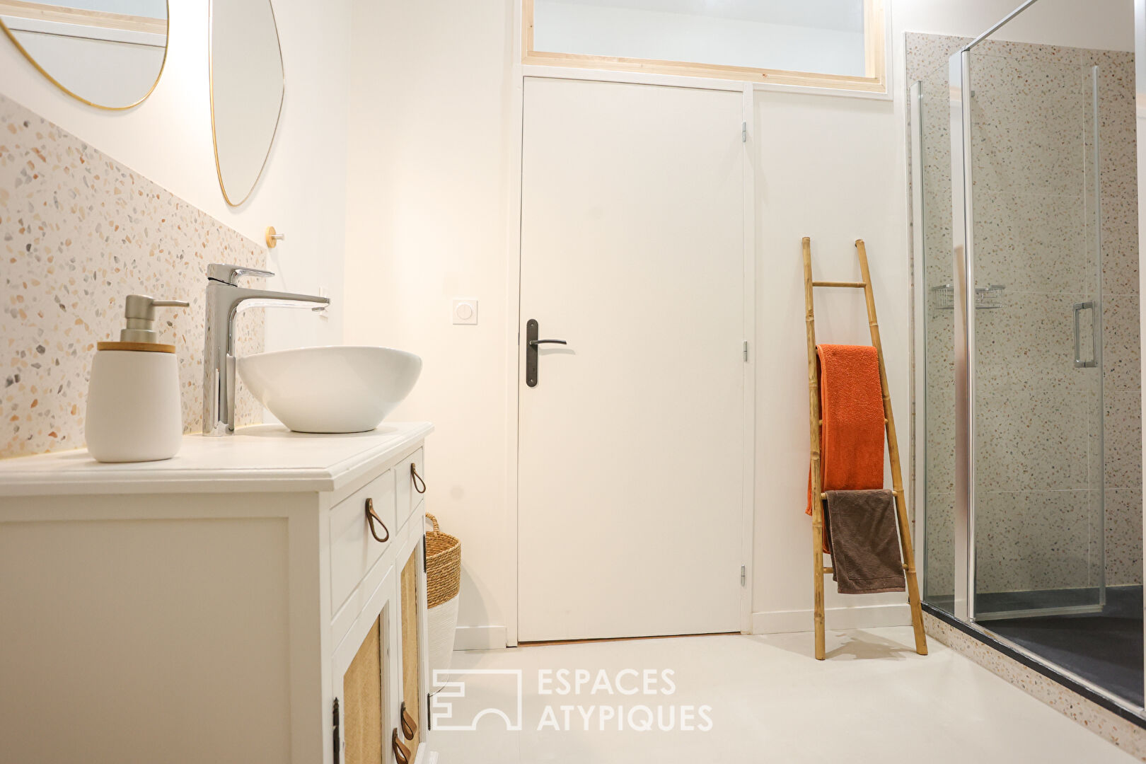 Depuis l’entrée principale l’escalier design conduit à un dégagement desservant 2 chambres au charme délicat qui se partagent une salle d’eau.