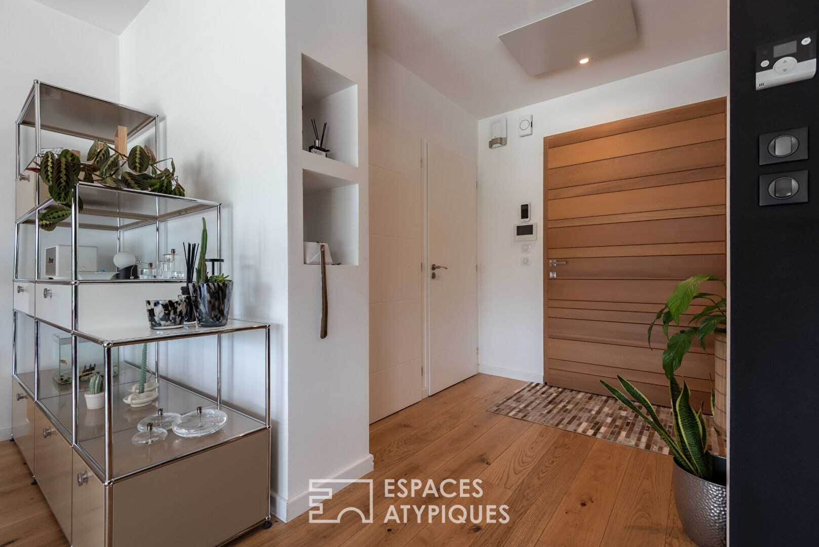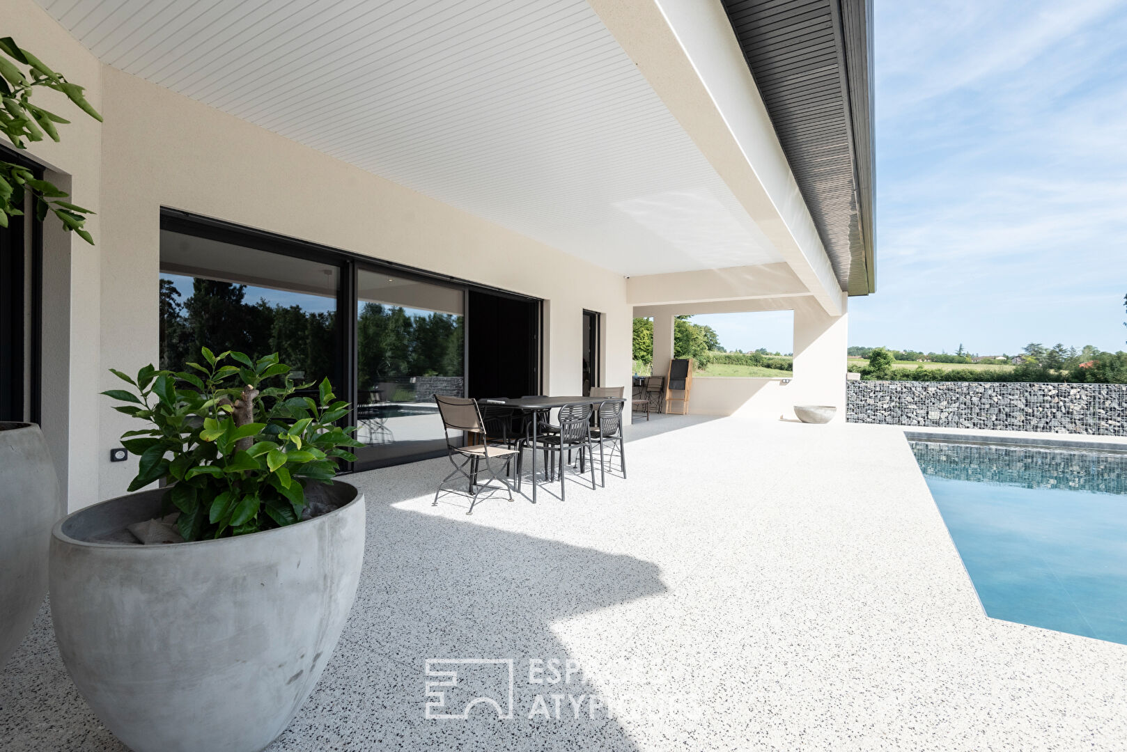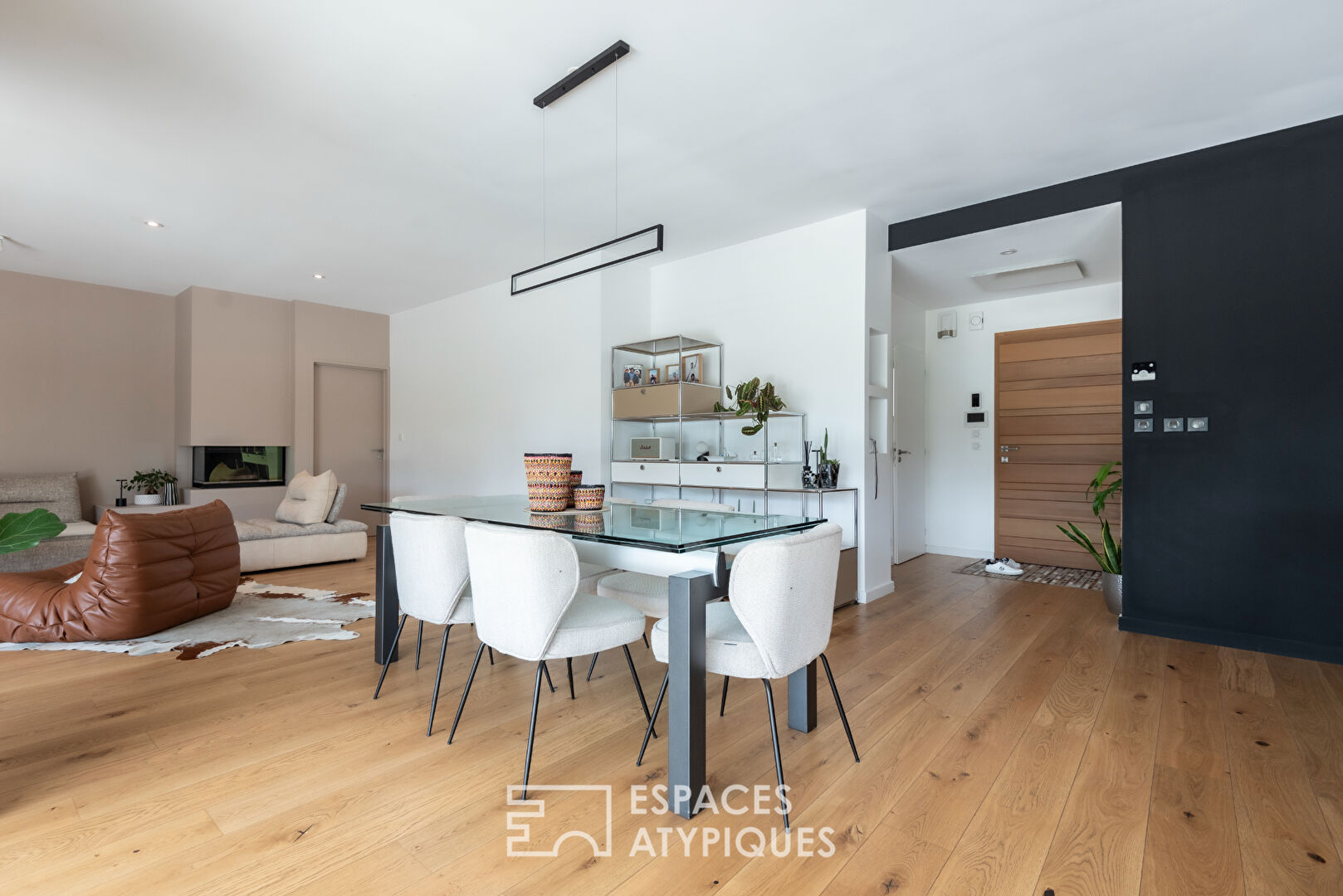 Le hall d’accueil ouvre sur une vaste pièce de vie baignée de lumière naturelle grâce à ses grandes baies vitrées qui offrent une vue panoramique sur le jardin et la piscine.