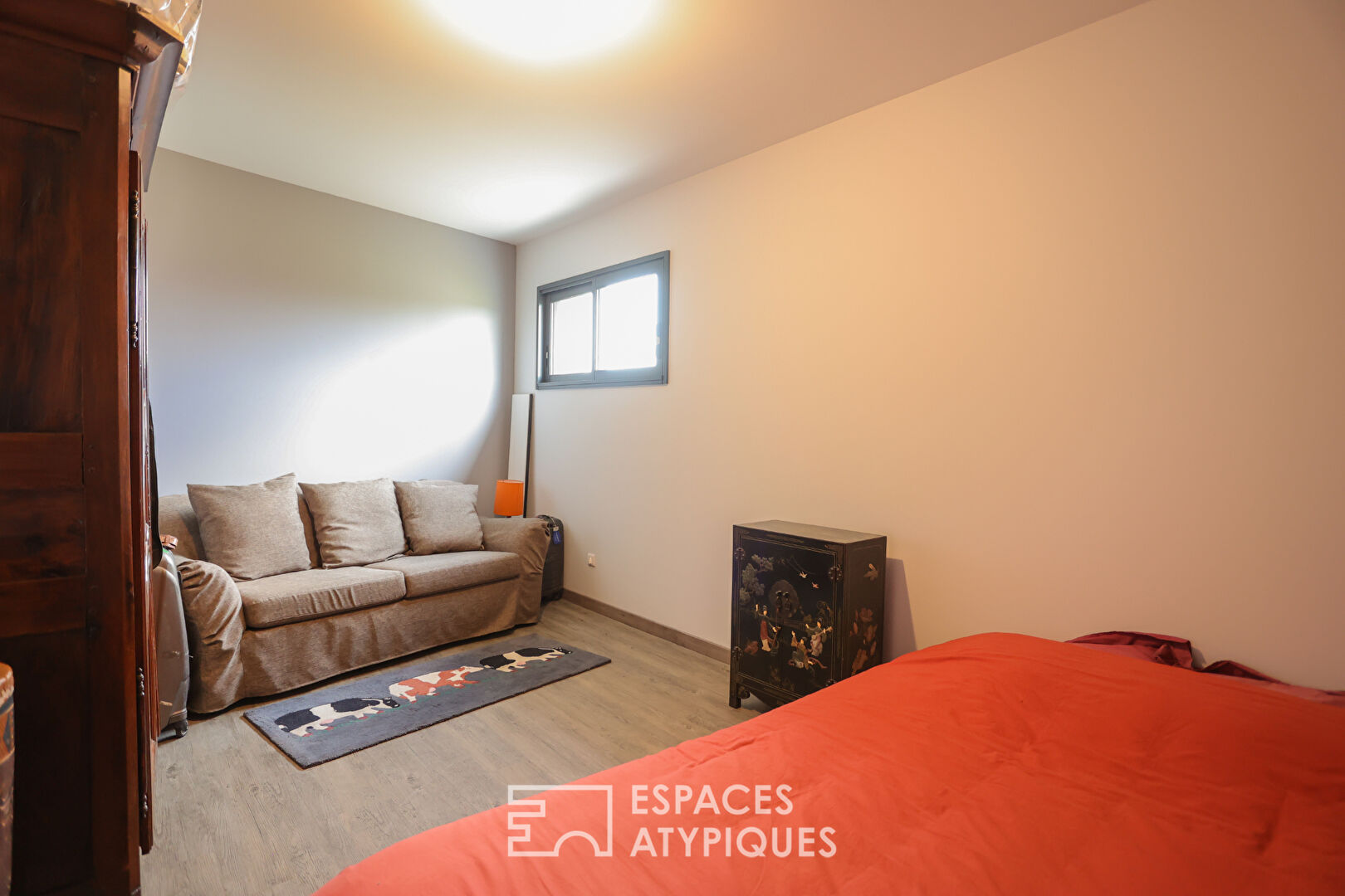 À l’étage, l’espace nuit se compose de quatre chambres confortables, d’un bureau pour vos moments de travail, et d’une salle de bains élégante.