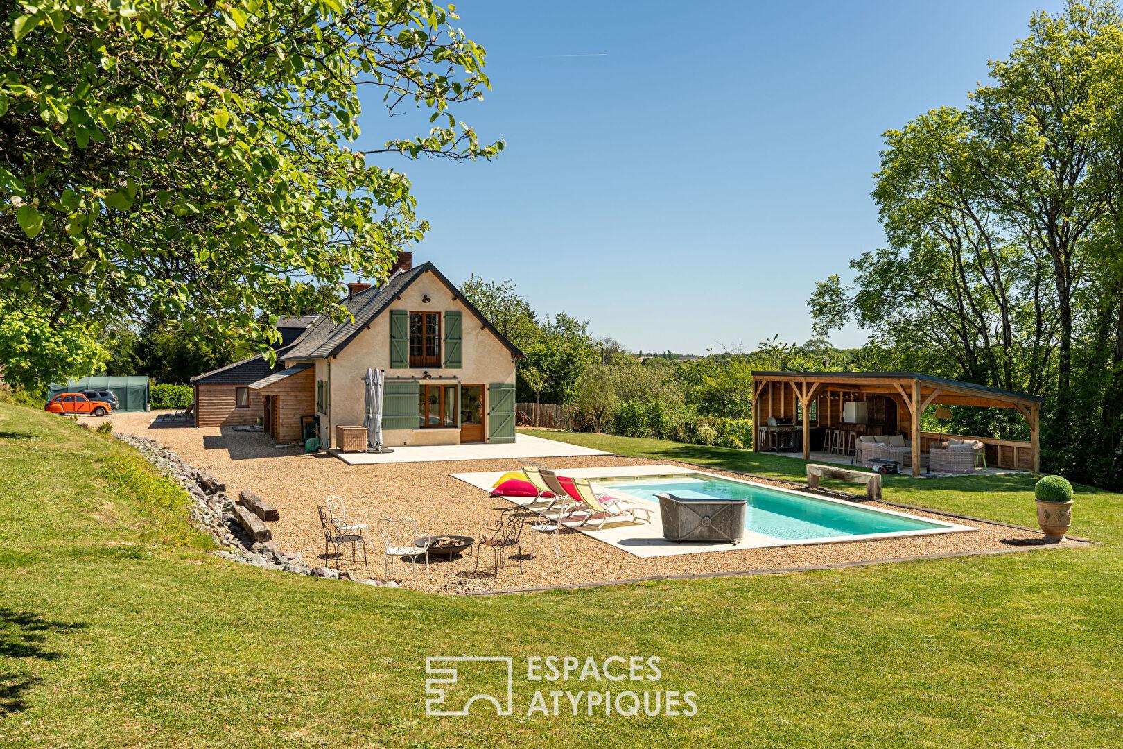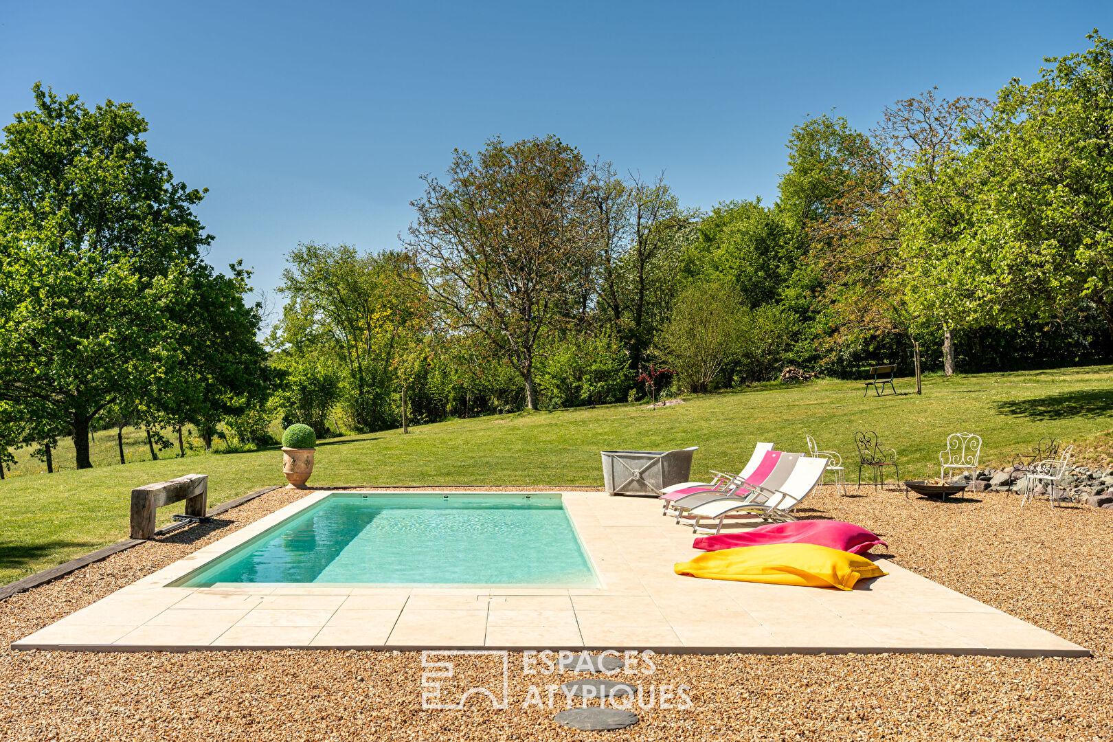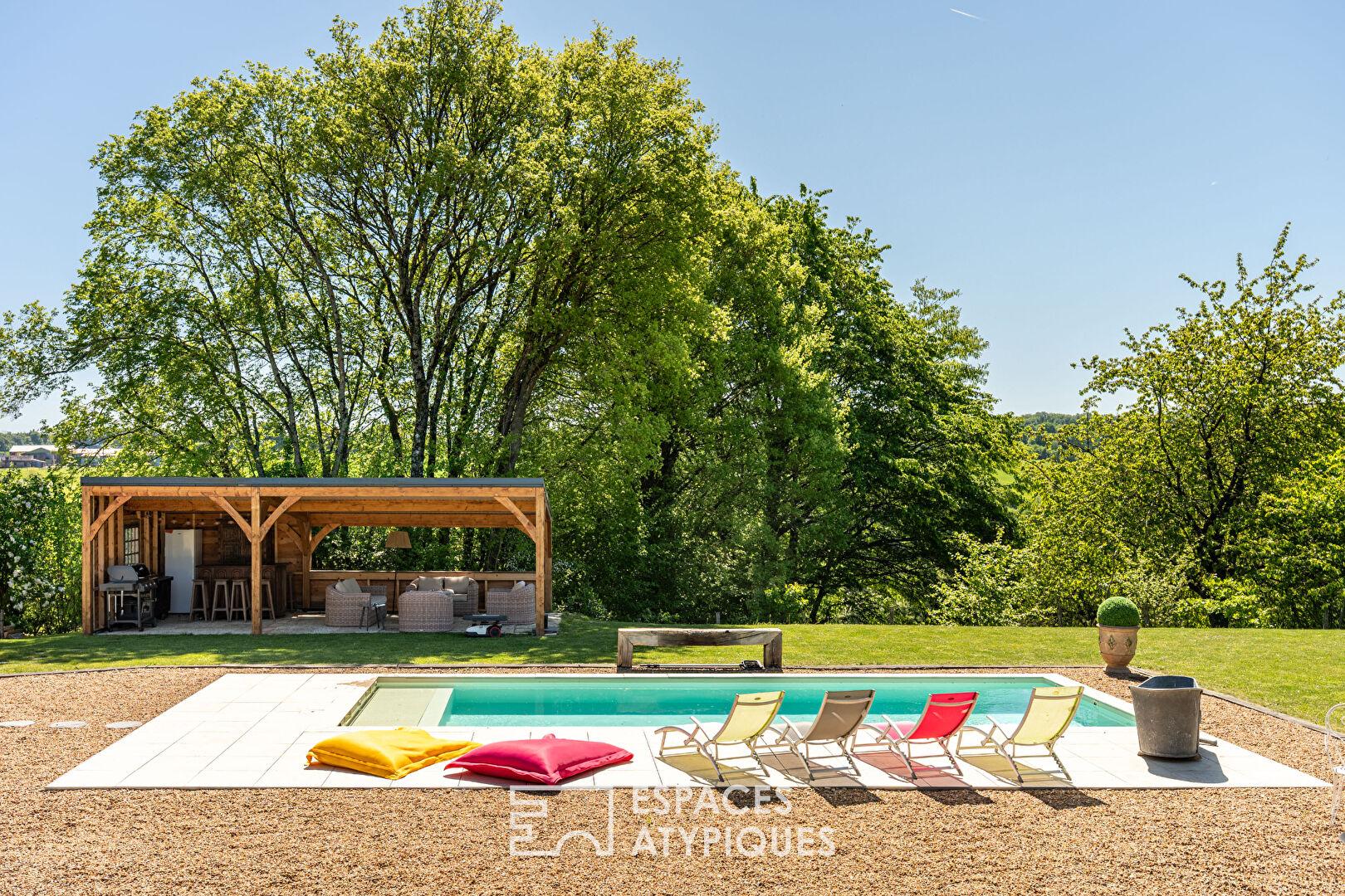 Côté jardin, laissez-vous porter par la magie du lieu. Un vaste terrain de plus de 7 000 m² vous invite à la contemplation. La terrasse ensoleillée, accessible depuis les pièces de vie, est l’endroit idéal pour partager des repas en famille ou entre amis. Une superbe piscine sécurisée aux lignes épurées prolonge les plaisirs de l’été. Une cuisine d’été couverte, avec barbecue et bar, promet de belles soirées conviviales au bord de la piscine. Un studio indépendant de près de 23 m², avec salle d’eau et WC, offre de multiples possibilités : chambre d’amis, gîte, espace pour adolescent… Une dépendance avec atelier, une cave, un abri de jardin et un abri bois complètent cet ensemble unique.