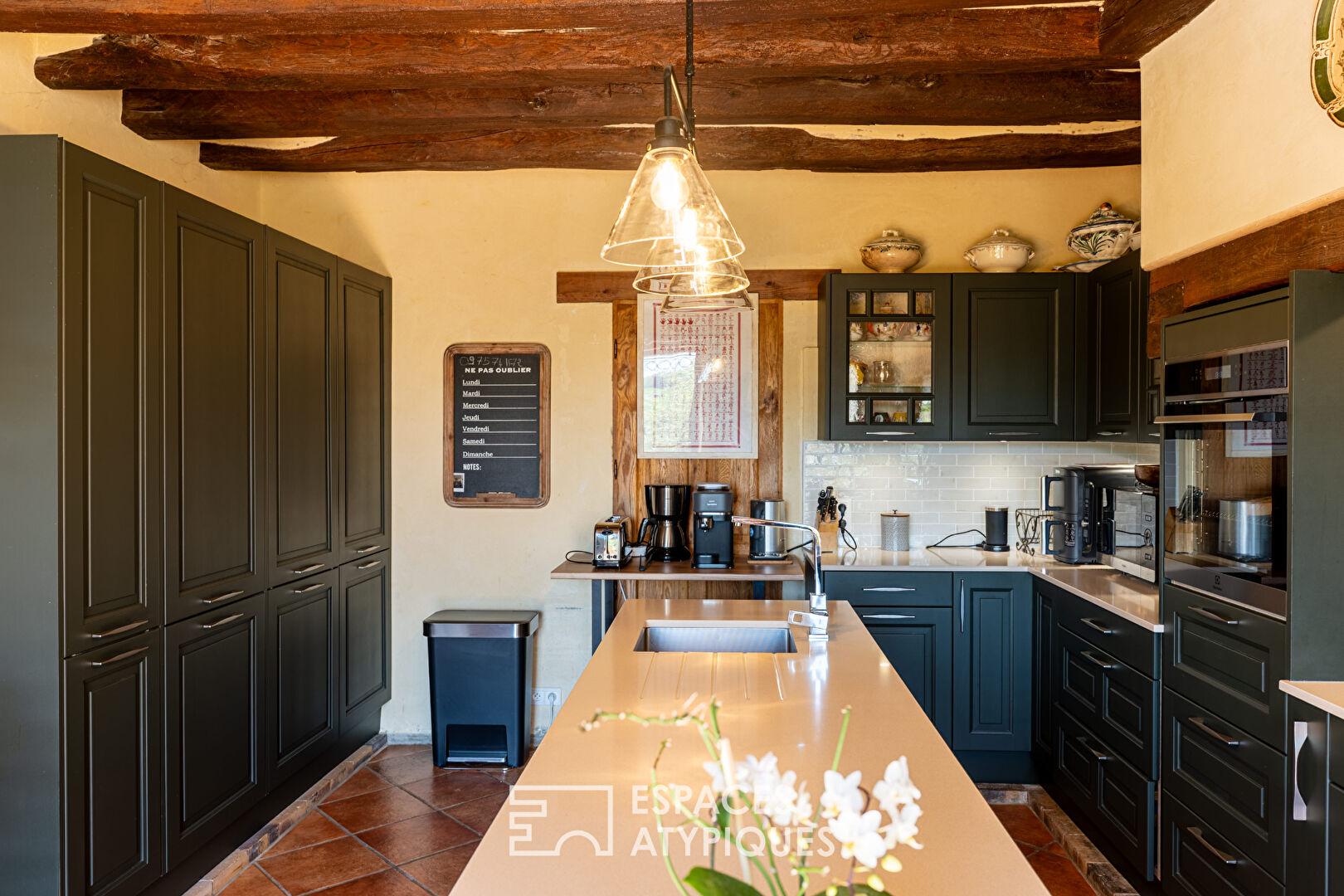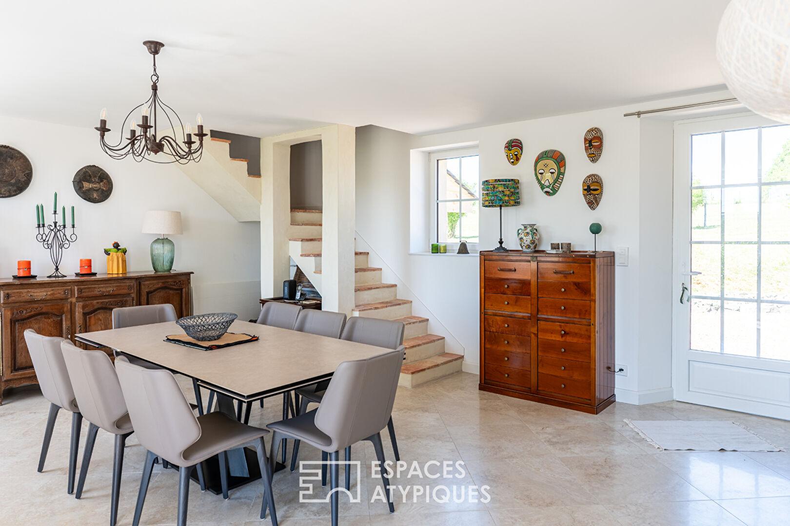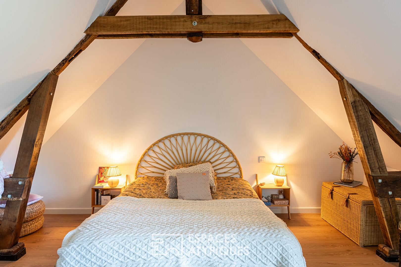 L’intérieur est une ode à la fluidité et aux matériaux nobles. Le rez-de-chaussée se dévoile comme une succession d’espaces de vie harmonieux et lumineux. La cuisine, véritable coeur de la maison, a été pensée avec soin : îlot central convivial, équipements modernes, plans de travail en pierre, elle se marie à merveille avec les éléments anciens. Deux grands séjours lumineux, dont un avec poêle à bois, et un salon cosy offrent des espaces de détente variés, largement ouverts sur la terrasse et le jardin grâce à de grandes baies vitrées. Côté nuit, ce niveau propose deux premières suites parentales, offrant un confort de plain-pied et une intimité préservée. Un bureau, une buanderie et deux WC complètent ce niveau.