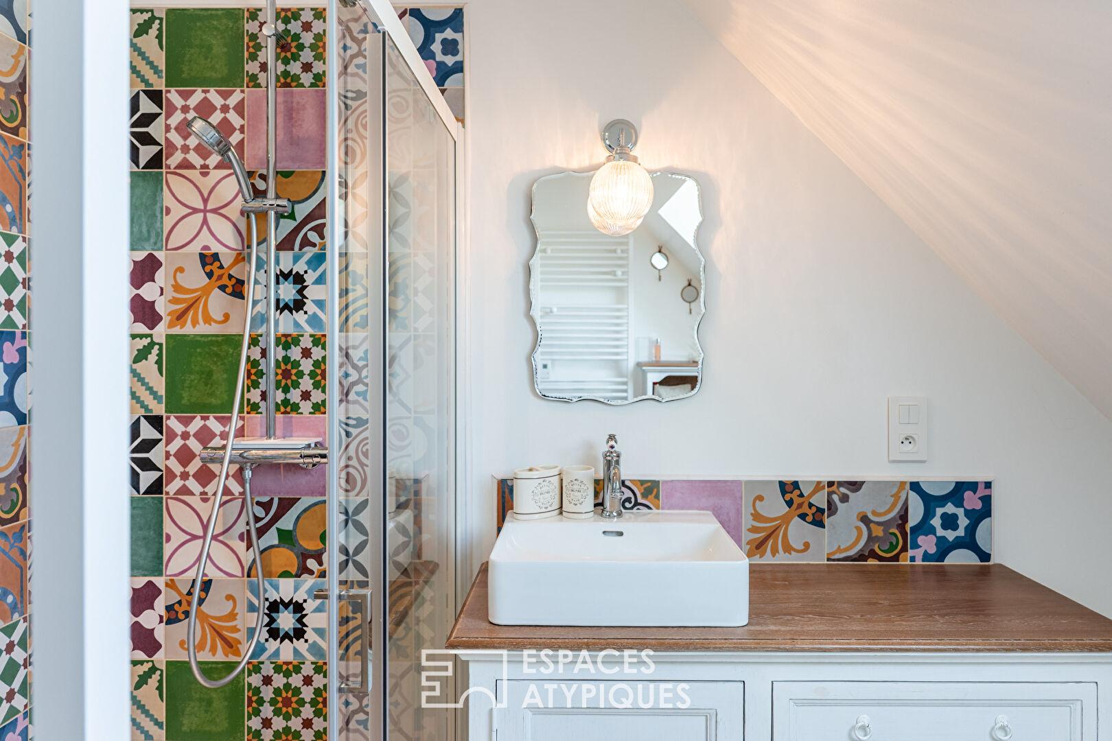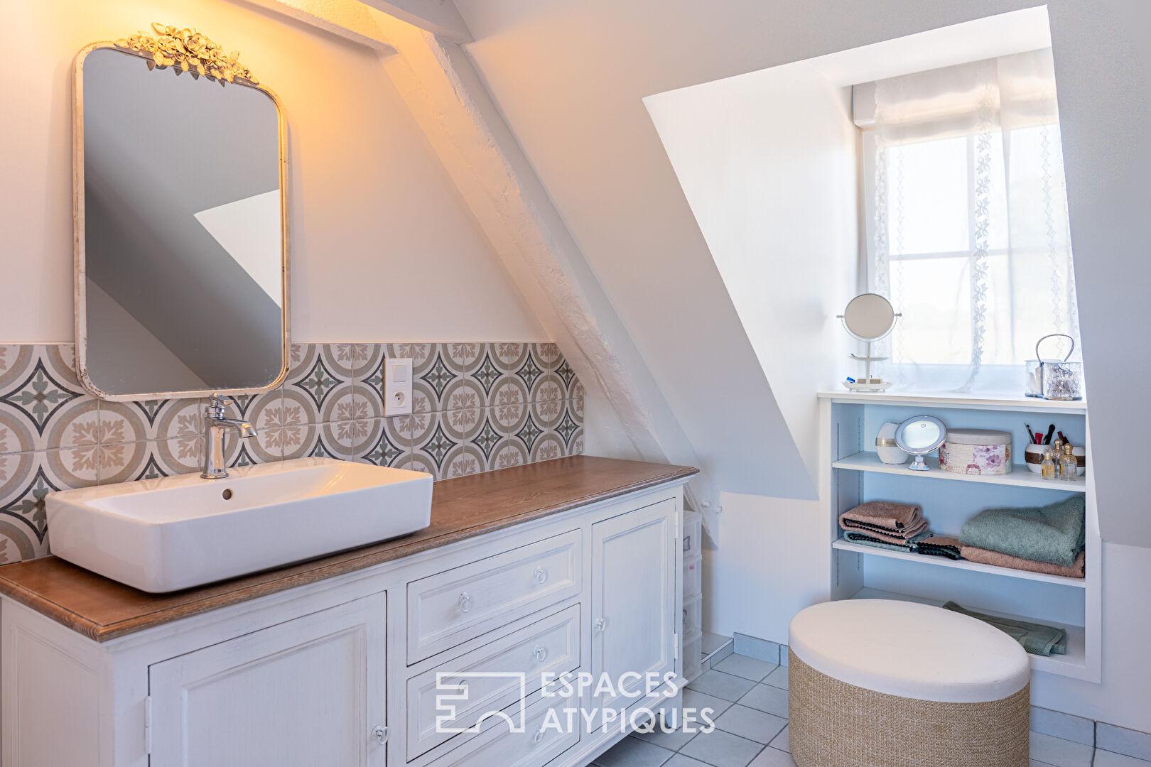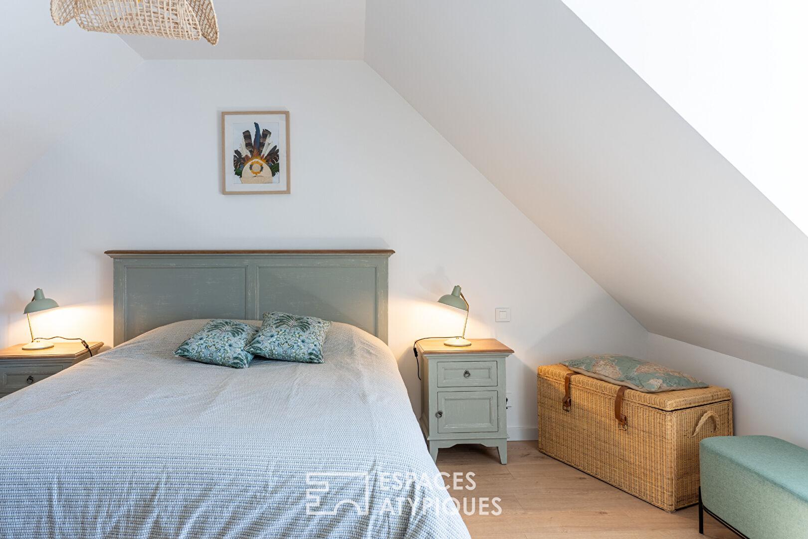Aux étages, quatre chambres aux dimensions généreuses, dont deux suites parentales avec leur propre salle d’eau et dressing. Une autre salle d’eau moderne et un WC indépendant assurent le confort de toute la famille. Les volumes sous-pentes confèrent un charme unique à cet étage, idéal pour créer un coin lecture, un espace de jeu ou un atelier d’artiste.