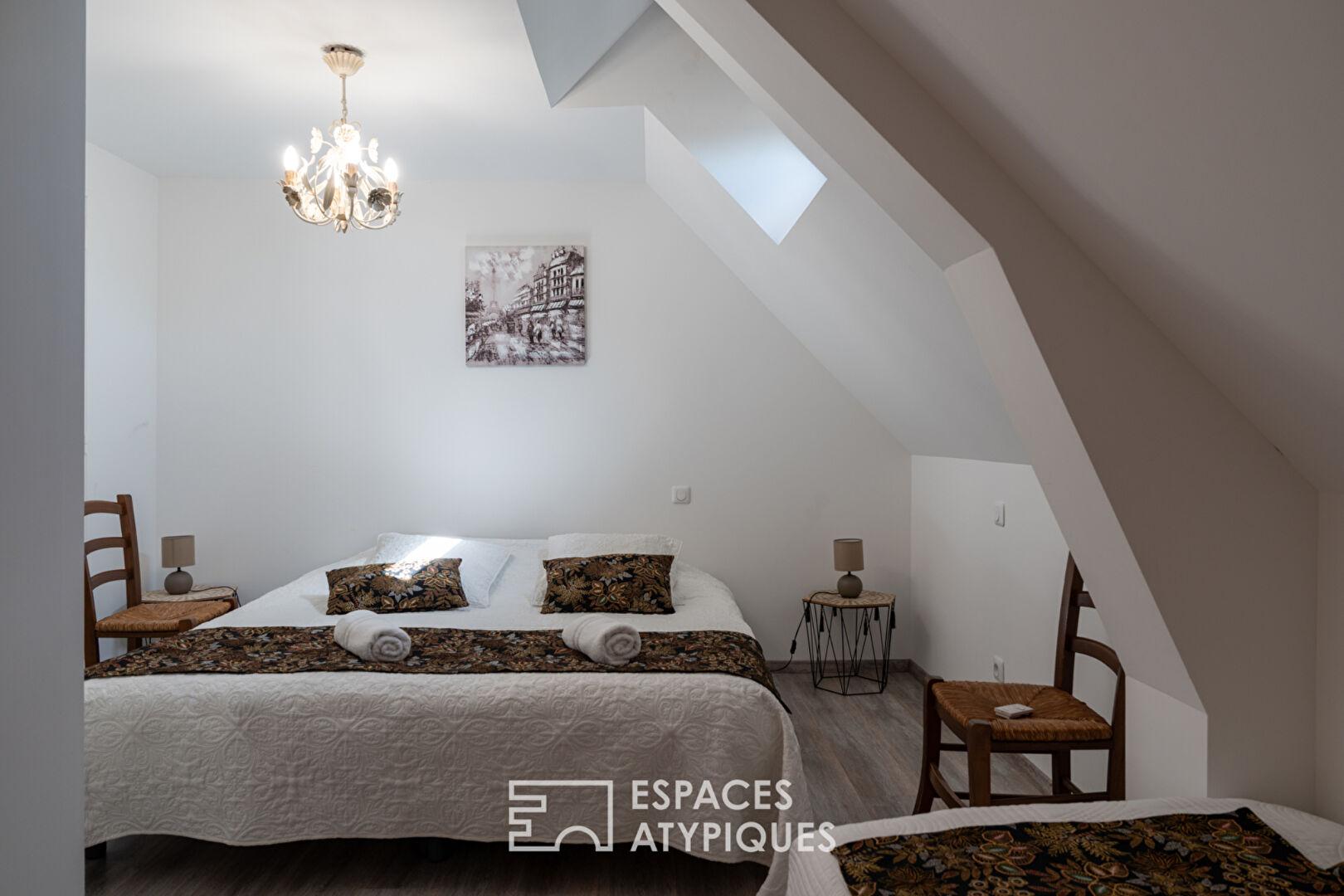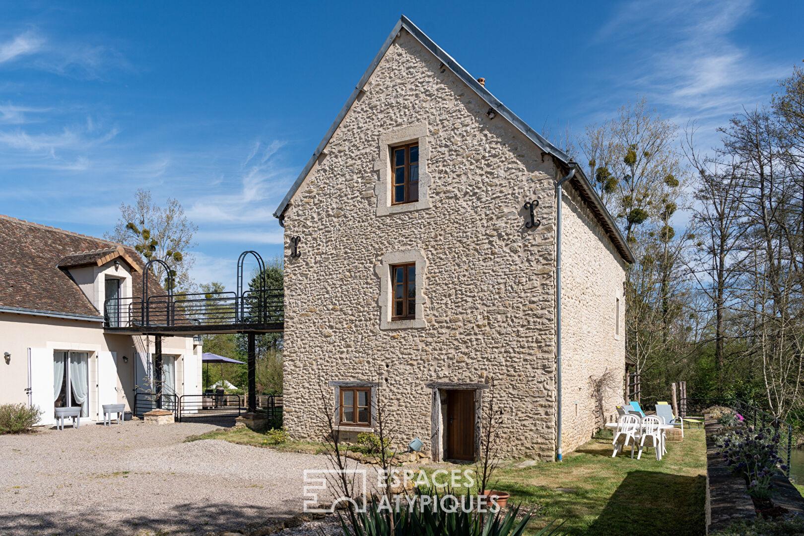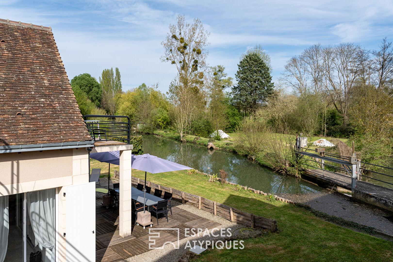L’intérieur de la maison principale séduit par ses volumes généreux et sa luminosité. Son séjour chaleureux, avec cheminée, s’ouvre sur une grande pièce conviviale. La suite parentale bénéficie d’une vue imprenable sur le moulin et l’écluse, offrant un réveil au fil de l’eau. Les gîtes, entièrement équipés, permettent d’accueillir famille, amis ou voyageurs en quête d’authenticité.