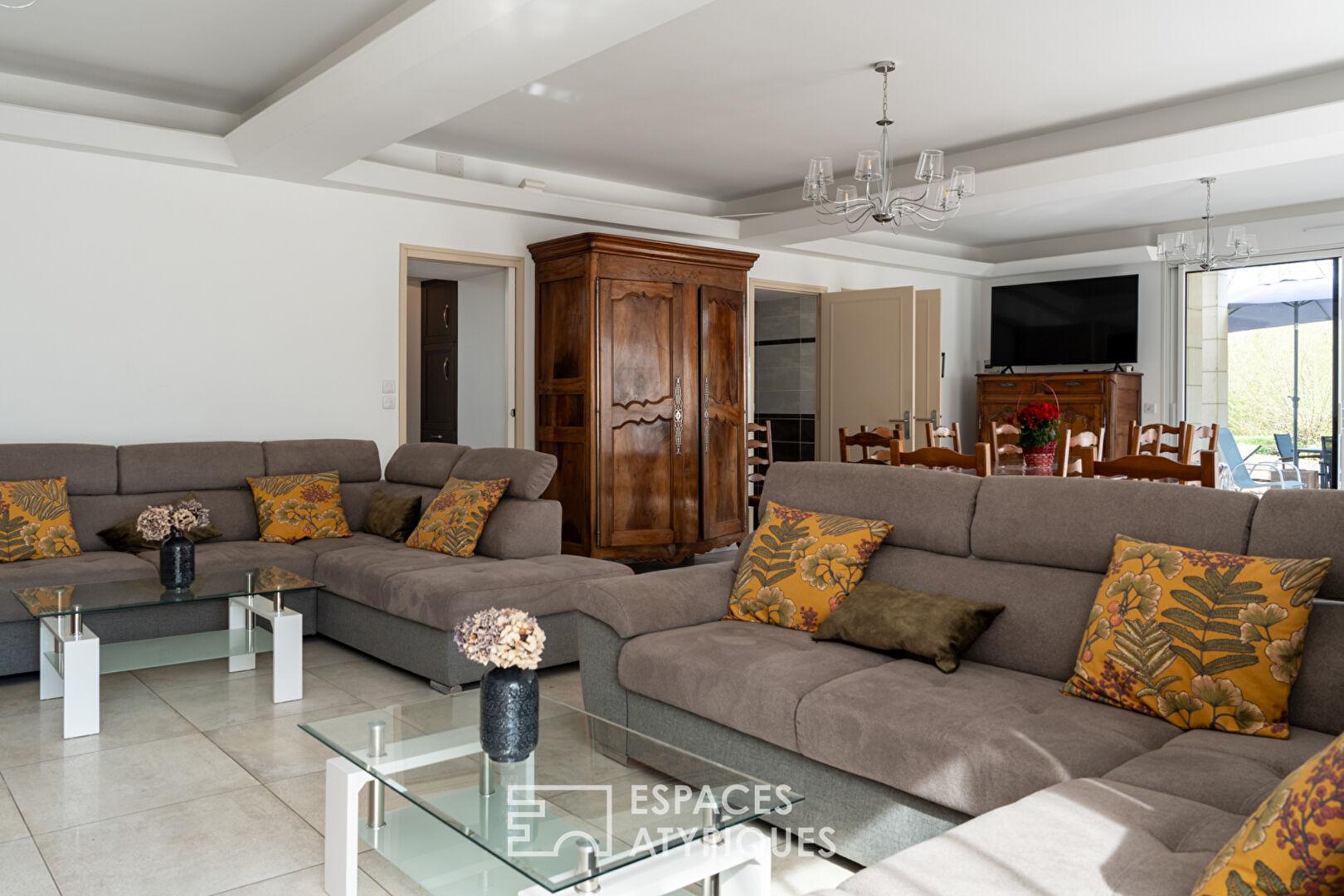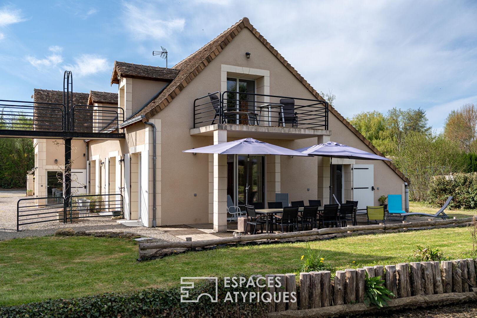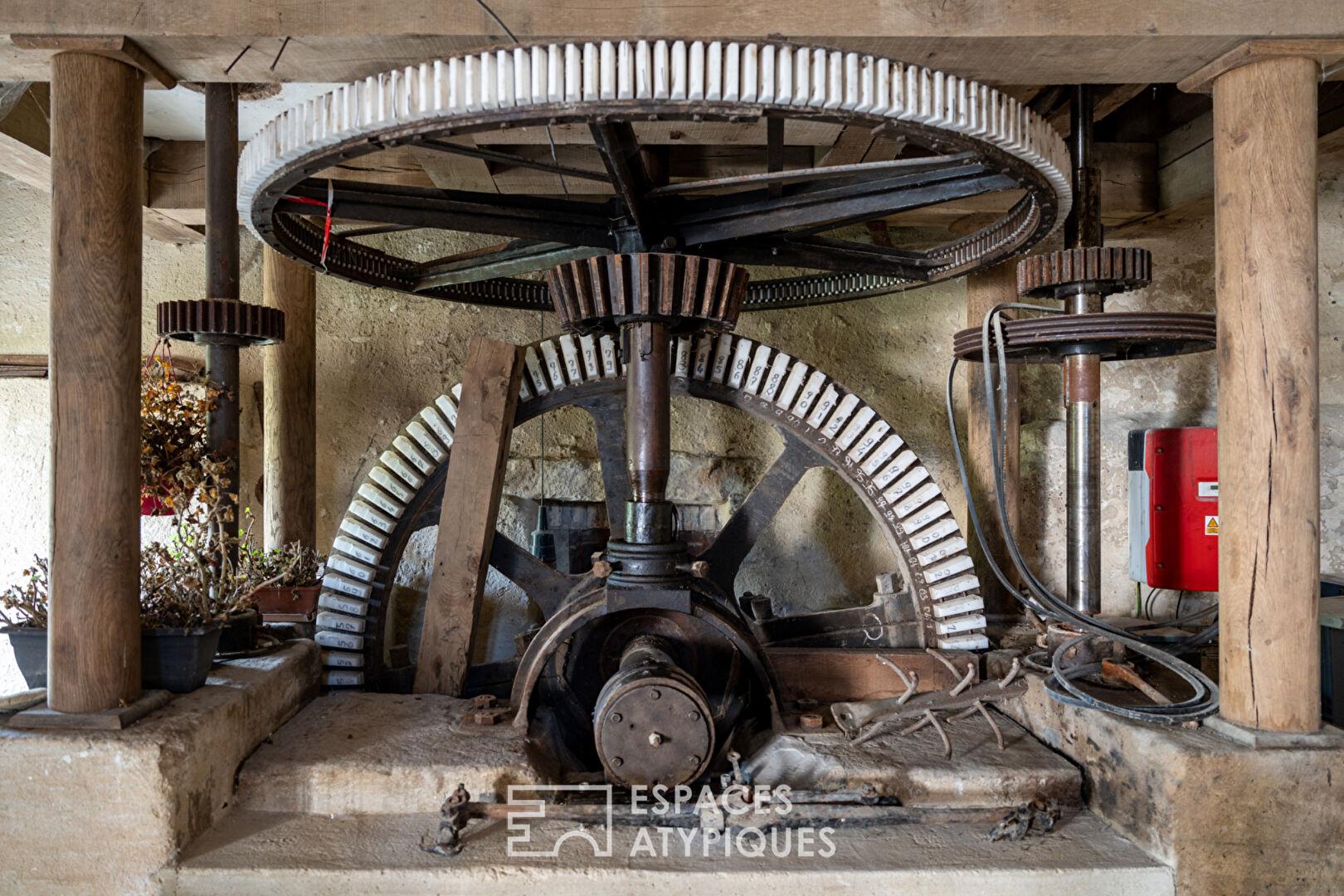 L’intérieur de la maison principale séduit par ses volumes généreux et sa luminosité. Son séjour chaleureux, avec cheminée, s’ouvre sur une grande pièce conviviale. La suite parentale bénéficie d’une vue imprenable sur le moulin et l’écluse, offrant un réveil au fil de l’eau. Les gîtes, entièrement équipés, permettent d’accueillir famille, amis ou voyageurs en quête d’authenticité.