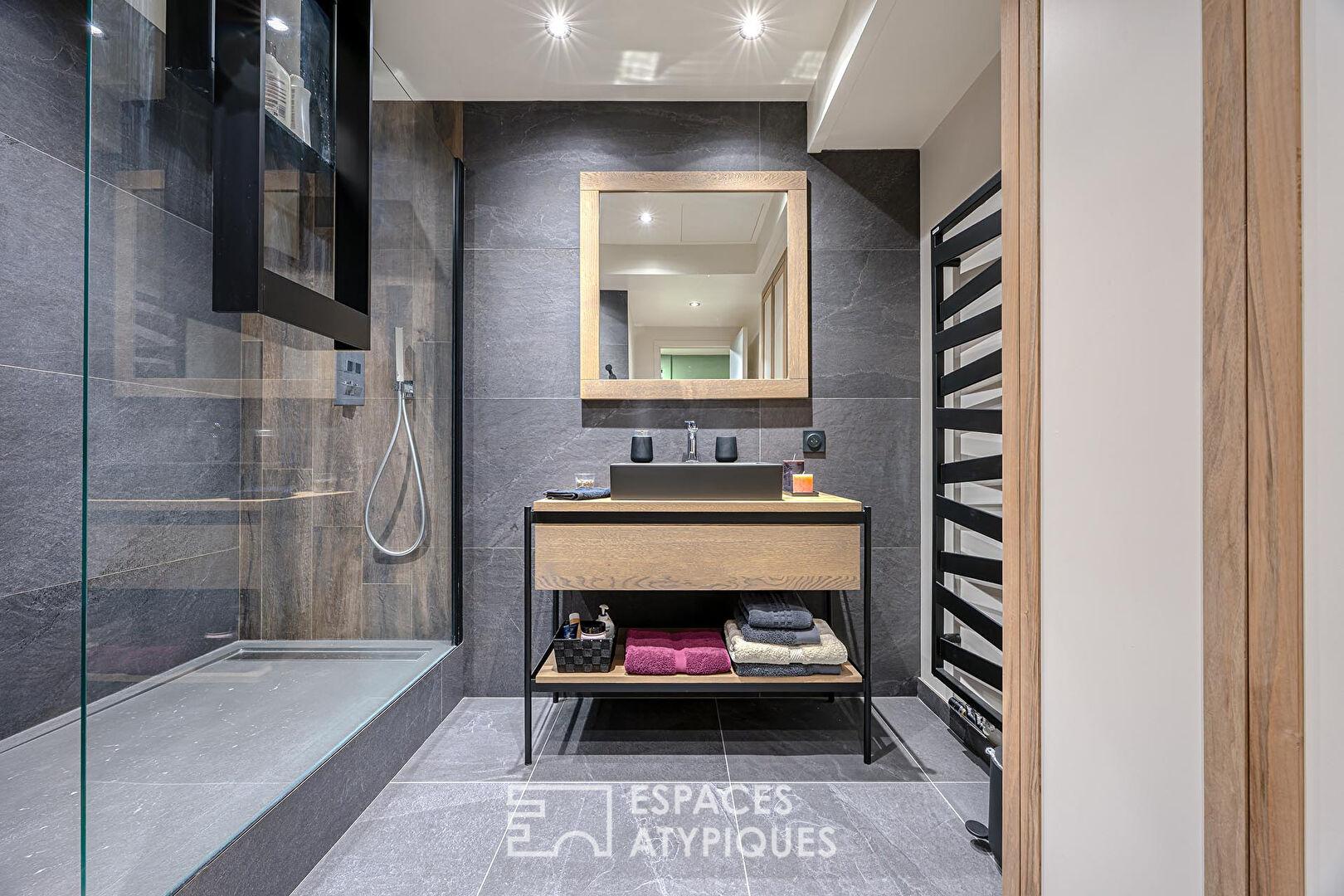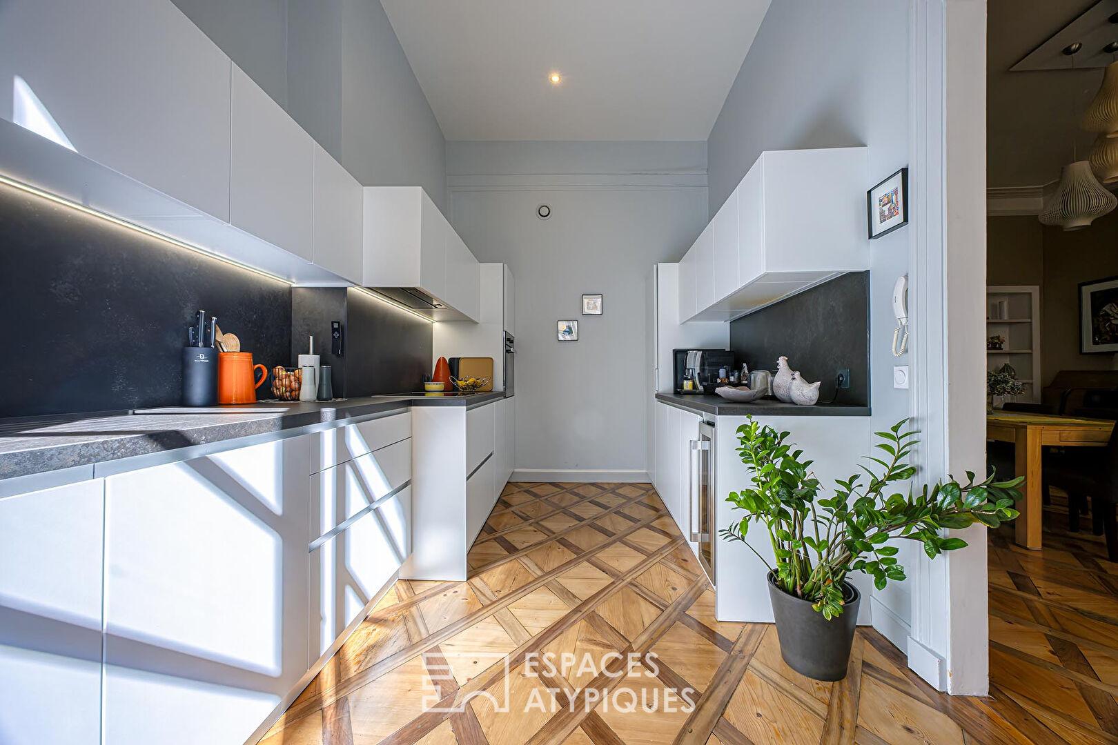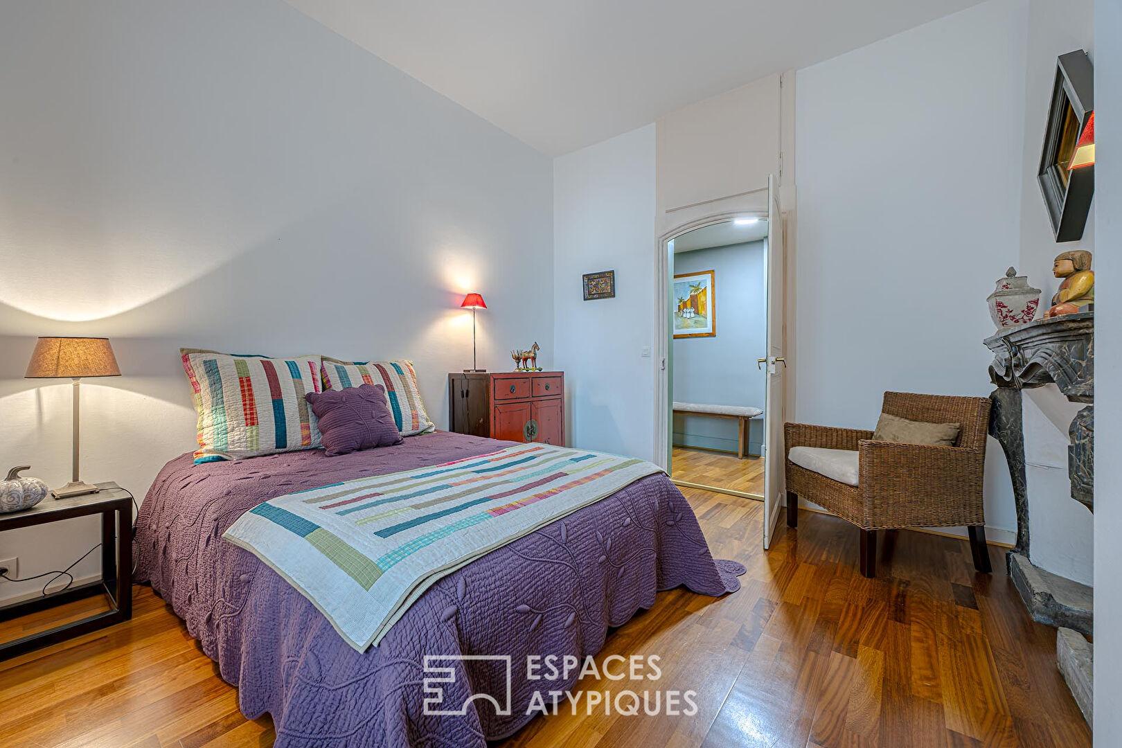 L’agencement intérieur se définit par sa fluidité et la noblesse de ses matériaux. Dès l’entrée, le ton est donné par des parquets d’époque parfaitement restaurés et une fresque historique ornant les plafonds, apportant un cachet inimitable aux pièces de réception. Le vaste salon de 43 m² et la salle à manger de 35 m², agrémentés de cheminées fonctionnelles, dialoguent avec une cuisine Bulthaup de dernière génération au design épuré. L’espace nuit se compose de trois grandes chambres, dont une suite parentale avec salle de bains privative, ainsi qu’une salle d’eau moderne.