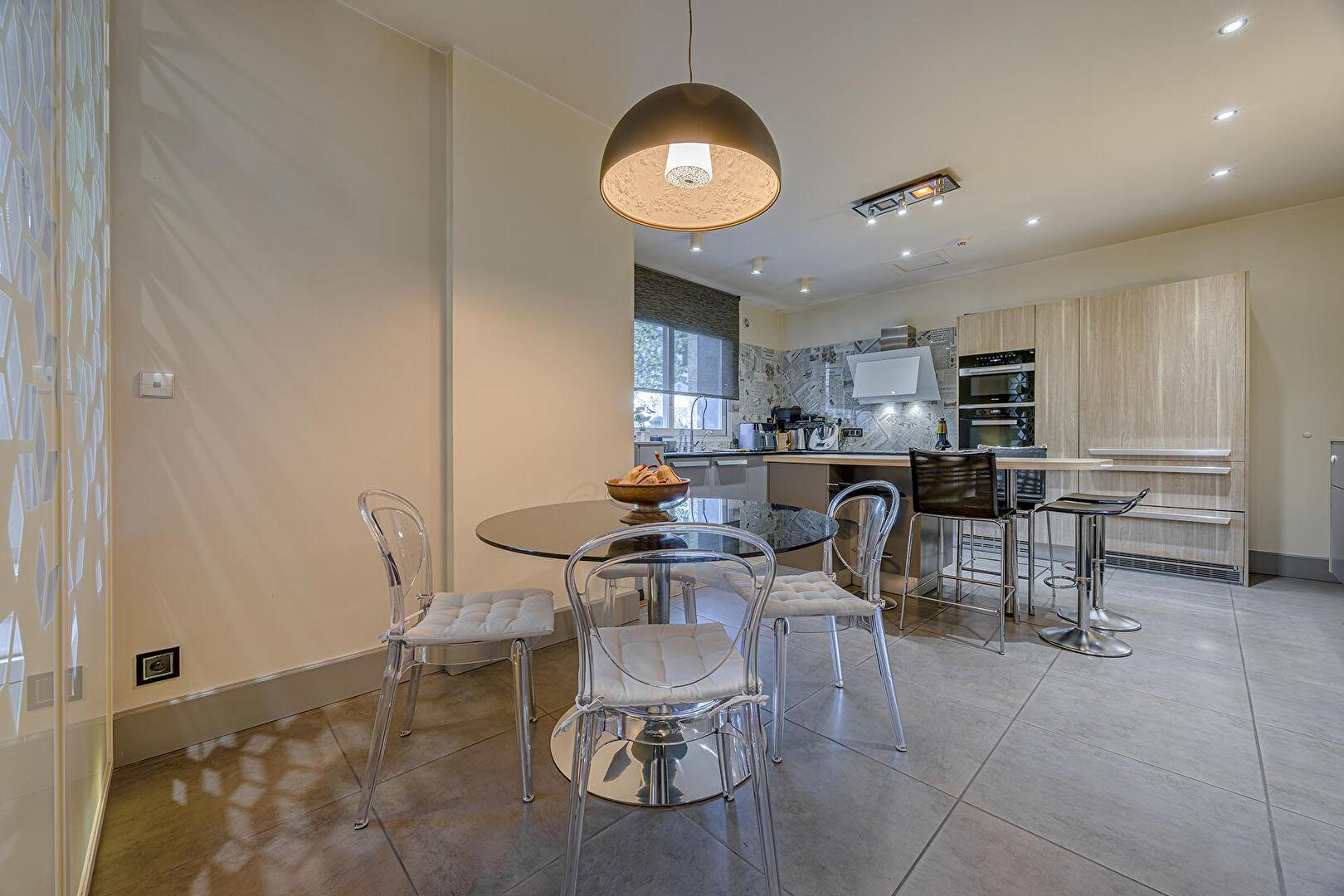 Le rez-de-chaussée est dédié à la réception et au quotidien : un vestiaire d’entrée, un grand salon-salle à manger avec cheminée et belle hauteur sous plafond, une cuisine séparée entièrement équipée offrant un beau potentiel d’aménagement et profitant d’un accès direct à l’extérieur, un bureau et des pièces de service.