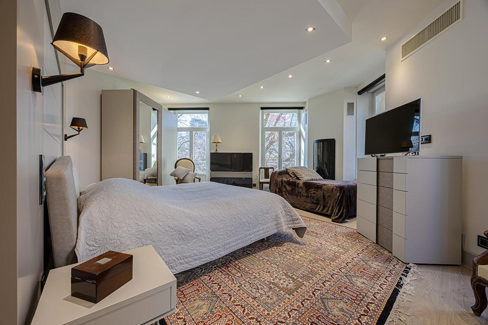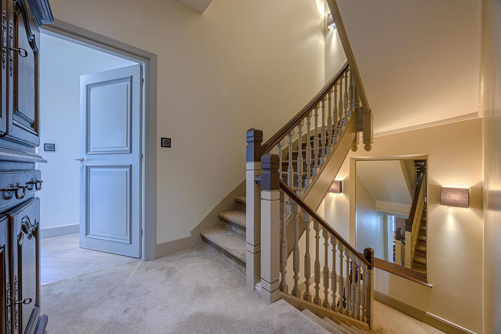 L’espace nuit se concentre au premier étage avec trois suites raffinées, dont une très grande suite parentale traversante avec cheminée, balcon, salle de bains et dressing. Chacune des autres suites bénéficie également de sa salle de bain, de son dressing, d’un bureau aménagé et d’un balcon.