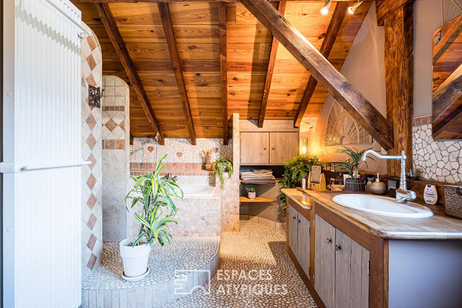 L’entrée s’ouvre sur une vaste pièce de vie baignée de lumière, organisée autour d’une cheminée qui souligne l’atmosphère chaleureuse de la maison. La cuisine, avec ses poutres apparentes, invite au partage et à la convivialité. Une suite parentale complète avec dressing et deux salles d’eau se situe également au rez-de-chaussée, offrant un confort optimal.