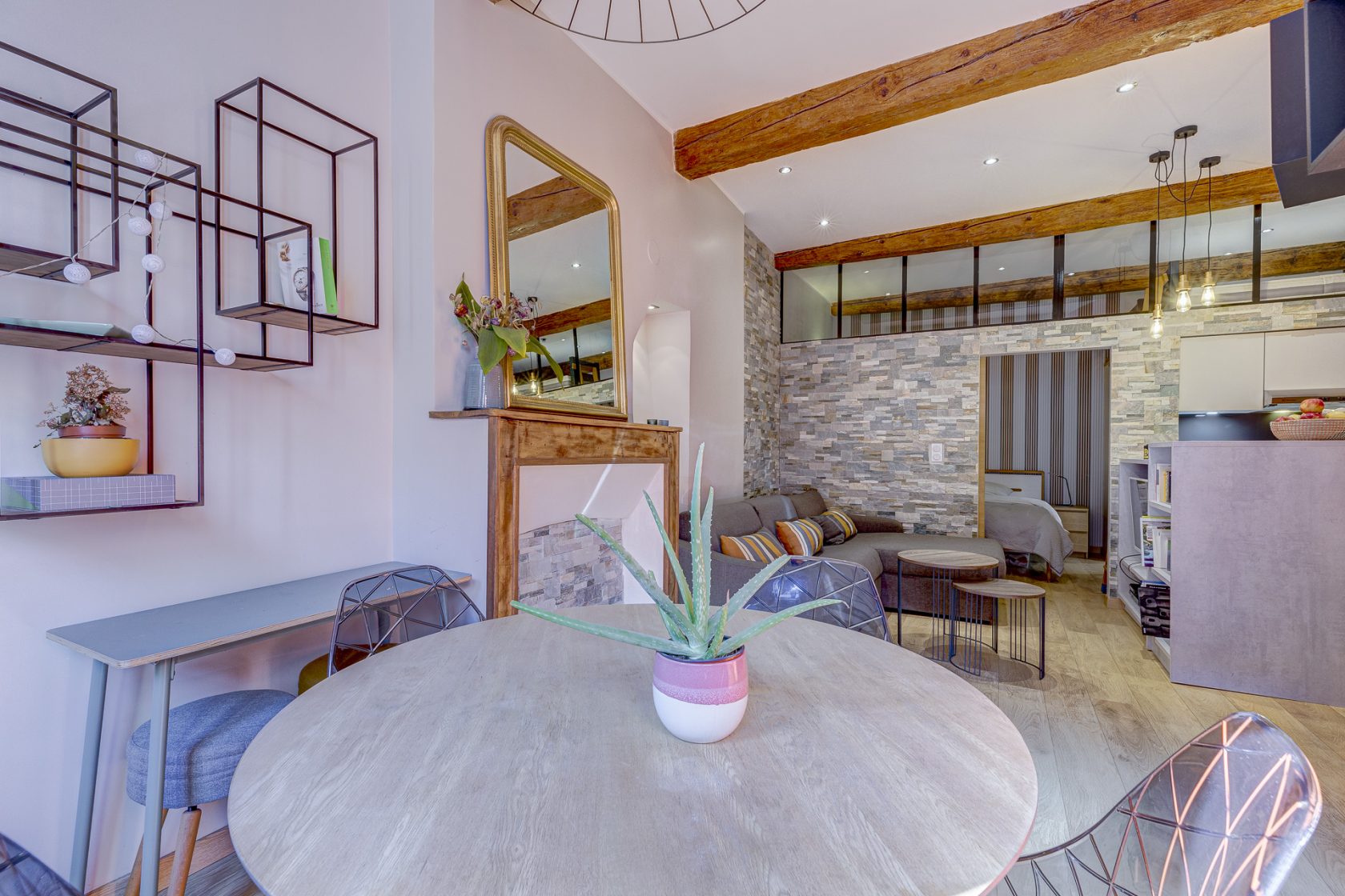 Les matériaux contemporains et anciens, qui se mélangent d’une façon très harmonieuse, font de ce bien un lieu unique. La confrontation des couleurs vives et des murs en pierre de parement, les poutres apparentes, et la belle hauteur sous plafond, rythment l’espace et accentuent le volume atypique.