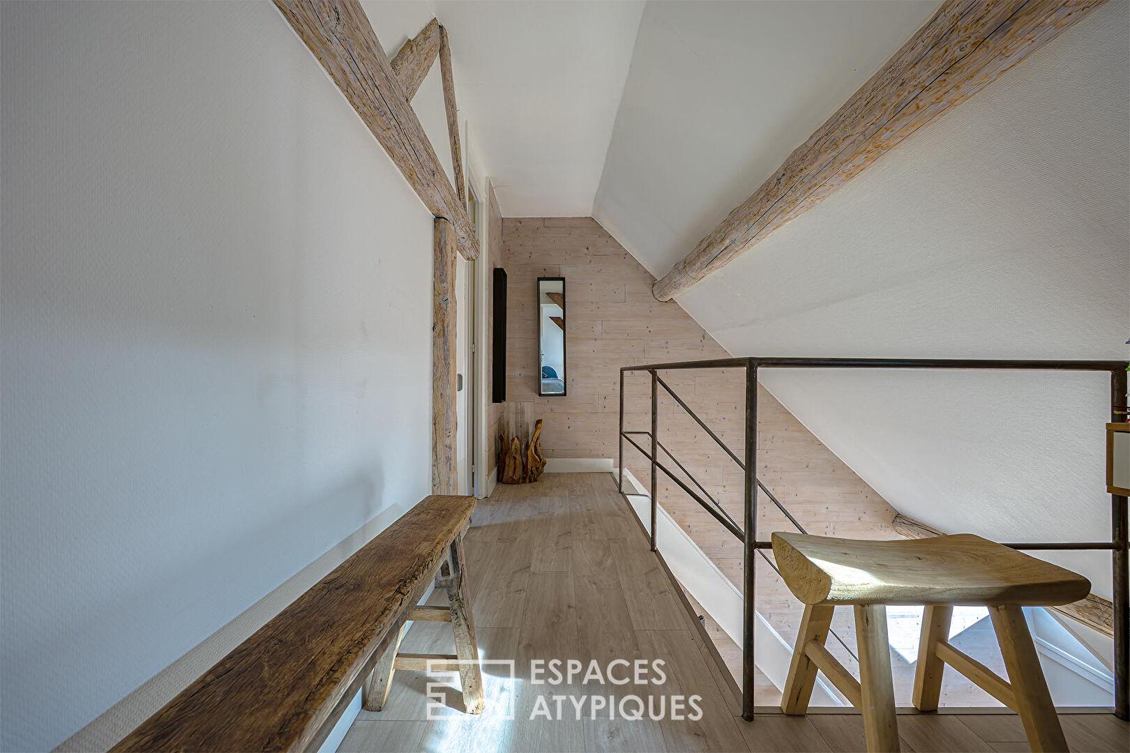 Un escalier mène à l’espace privatif qui situe à l’étage. Une mezzanine dessert deux autres chambres pleines de charmes, lovées sous les toits avec de belles poutres d’origine apparentes.