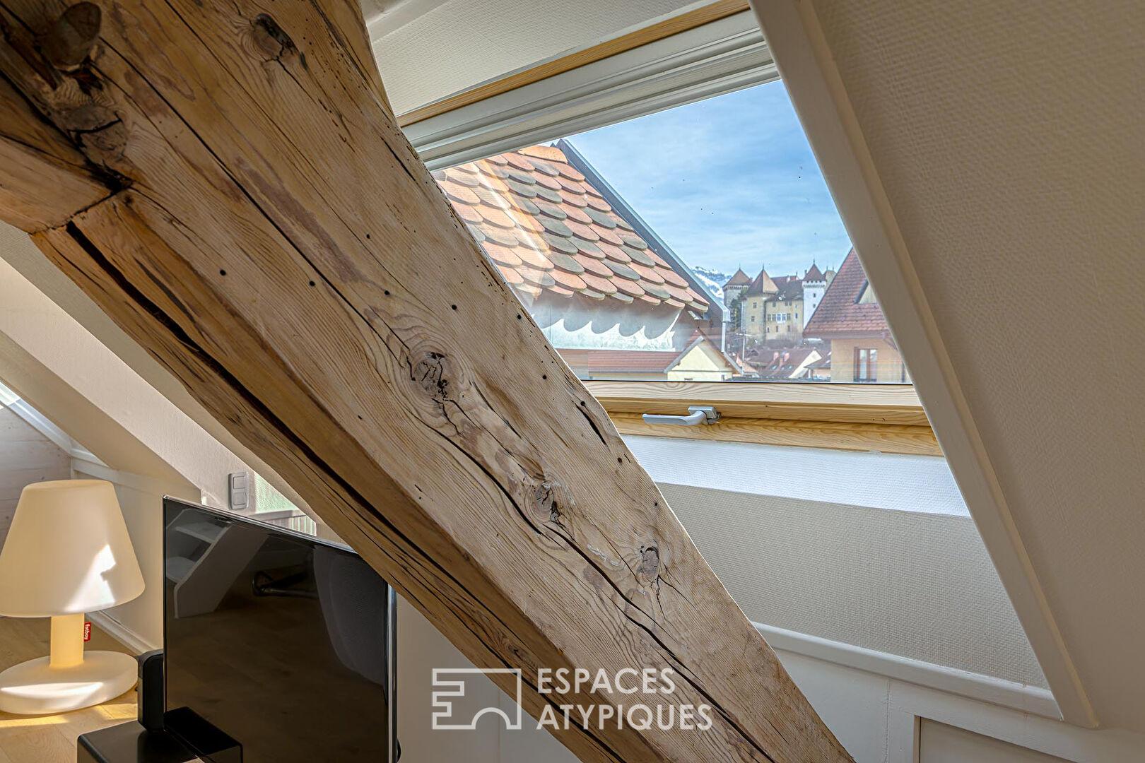 Situé au troisième et dernier étage sans ascenseur d’une copropriété de caractère en plein cœur d’Annecy, ce duplex de 132 m² au sol (82 m² carrez) est un véritable cocon suspendu.