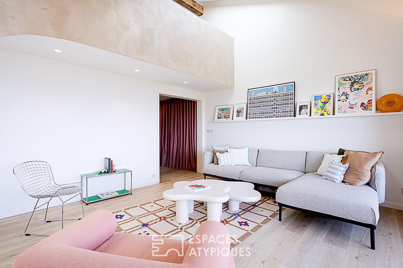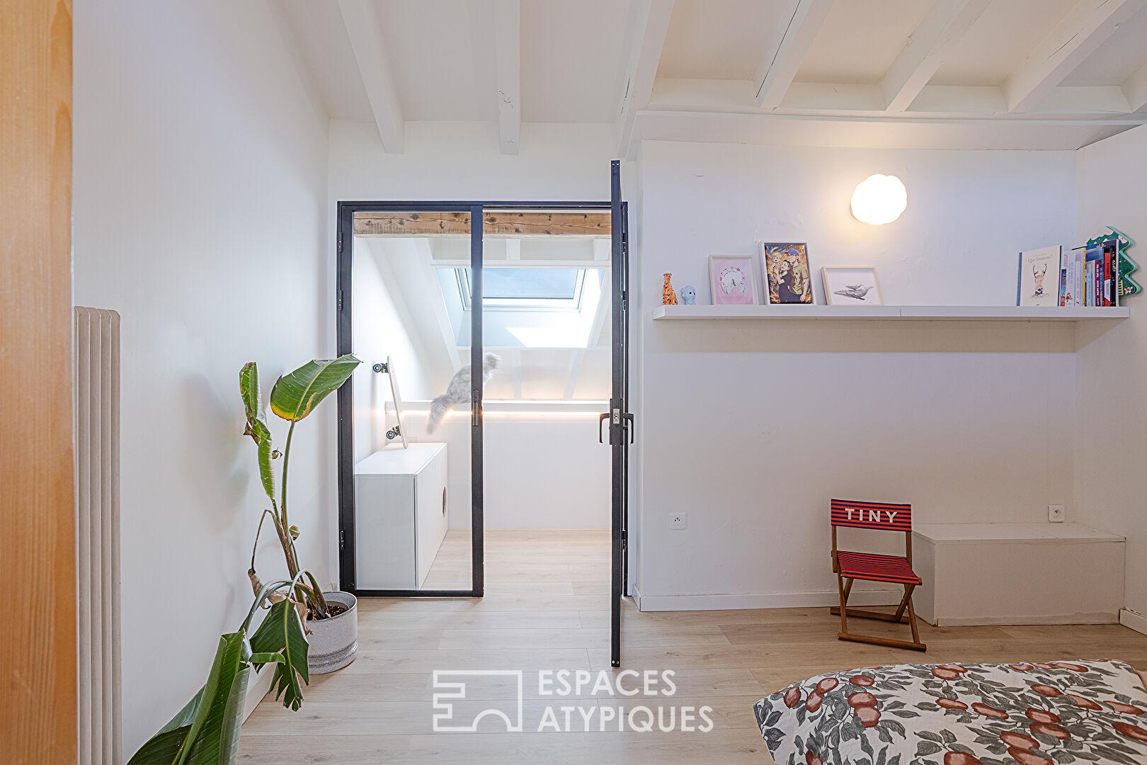 L’accès au niveau supérieur s’effectue depuis le salon par un bel escalier aux doux accents méditerranéens. Il dessert une étonnante passerelle surplombant la pièce de vie, véritable trait d’union vers la seconde zone de nuit. Celle-ci dessert une seconde suite, distribuée en deux pièces en enfilade ou chaque recoin est optimisé. Cet espace modulable laisse libre cours à vos projets : vaste chambre agrémentée d’un espace bureau inspirant, ou aménagement de deux coins nuit additionnel selon les besoins. Une seconde salle d’eau vient parfaire l’agencement sans faille de ce duplex.